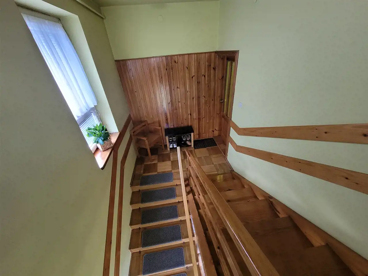 Na drugiej kondygnacji znajdziemy drugą kuchnię, salon z kominkiem, korytarz oraz łazienkę z prysznicem oraz wc; na półpiętrze- poddasze na którym znajduje się pokój przestronna sypialnia.