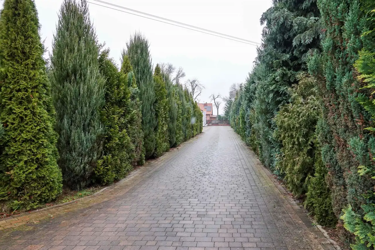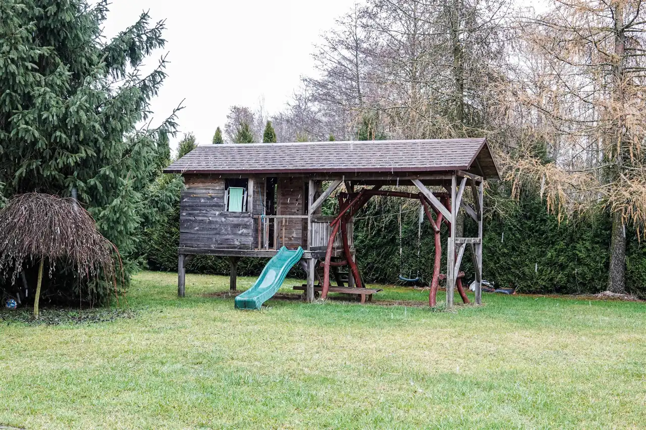 - dwa duże ogrody połączone alejkami z kostki brukowej oraz licznymi drzewami ozdobnymi. W jednym z ogrodów znajduje się domek dla dzieci – doskonałe uzupełnienie wiosennego życia rodzinnego.