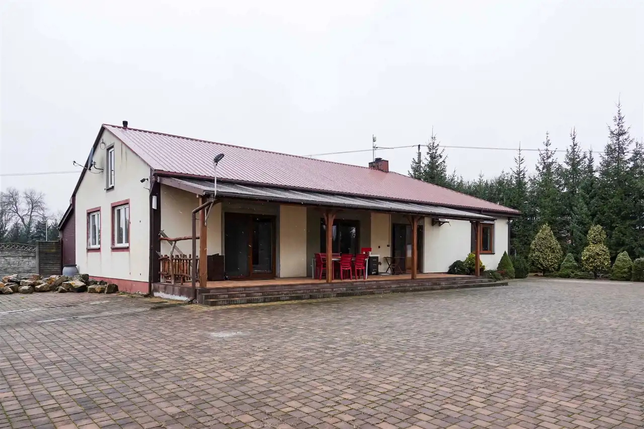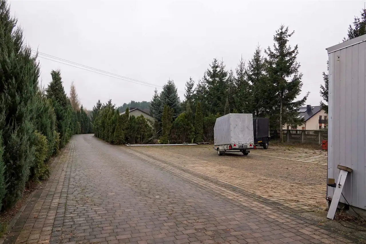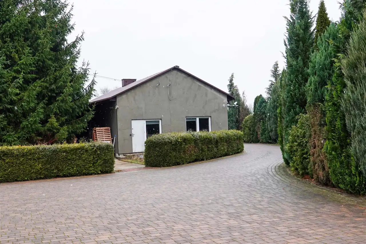 Przed wjazdem do posesji znajduje się duży parking oraz przestrzeń, na której niegdyś obecny był sklep. Dziś budynek jest w stanie rozbiórki. Miejsce można dowolnie wykorzystać – więcej przestrzeni dla rodziny lub działalność gospodarczą. Dom znajduje się w skrajnej części działki – o ciszę i spokój nie musimy się martwić.