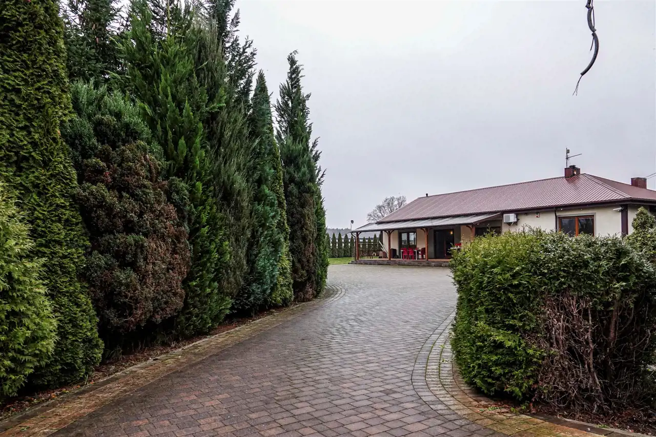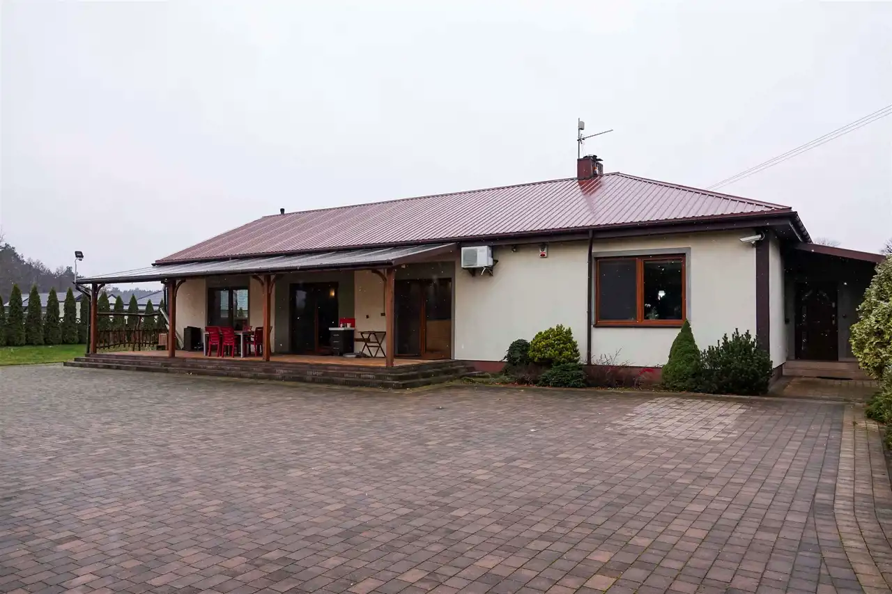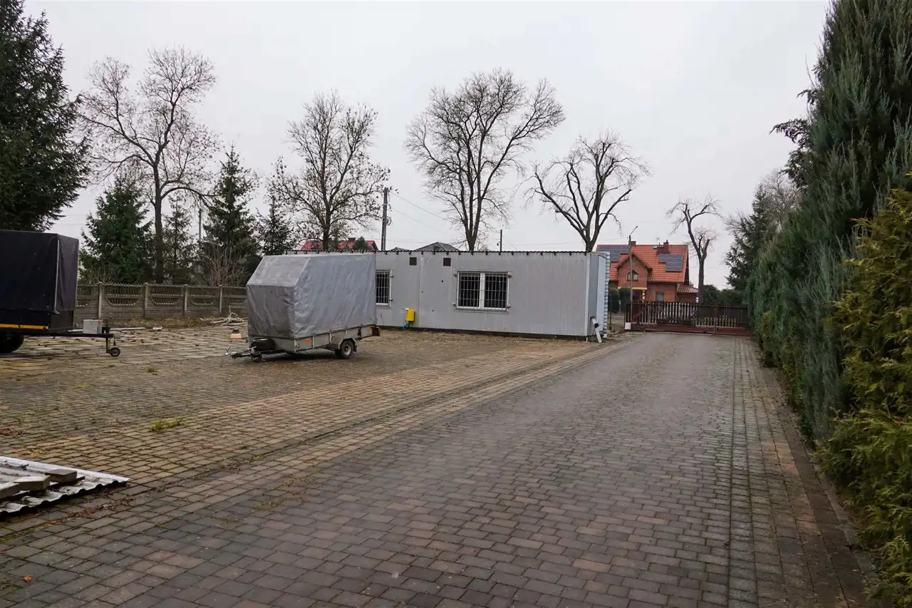 Przed wjazdem do posesji znajduje się duży parking oraz przestrzeń, na której niegdyś obecny był sklep. Dziś budynek jest w stanie rozbiórki. Miejsce można dowolnie wykorzystać – więcej przestrzeni dla rodziny lub działalność gospodarczą. Dom znajduje się w skrajnej części działki – o ciszę i spokój nie musimy się martwić.