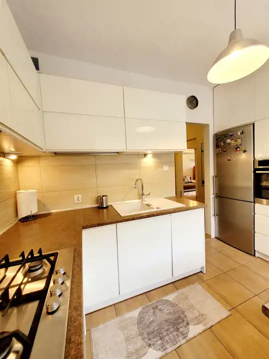 - kuchni w nowoczesnej zabudowie wyposażonej w zmywarkę, lodówkę, kuchenkę gazową, piekarnik,