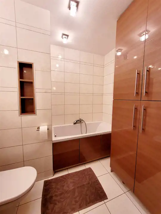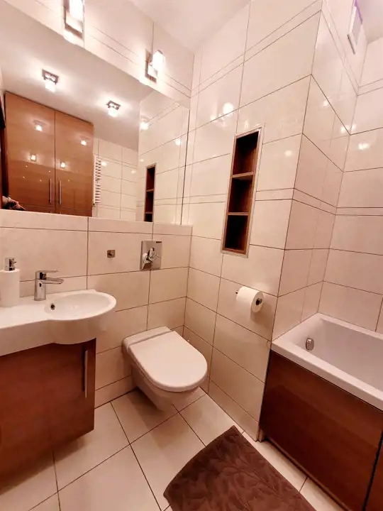 - łazienki połączonej z wc ( wanna) wyposażonej w sprytnie schowaną pralkę,
