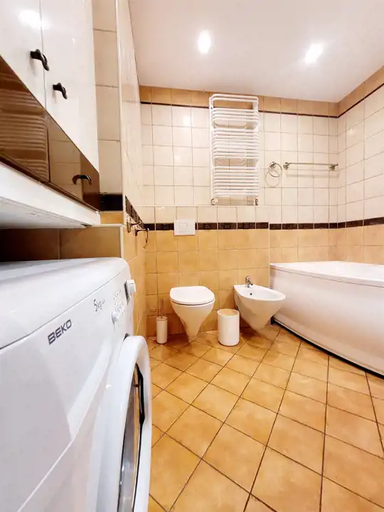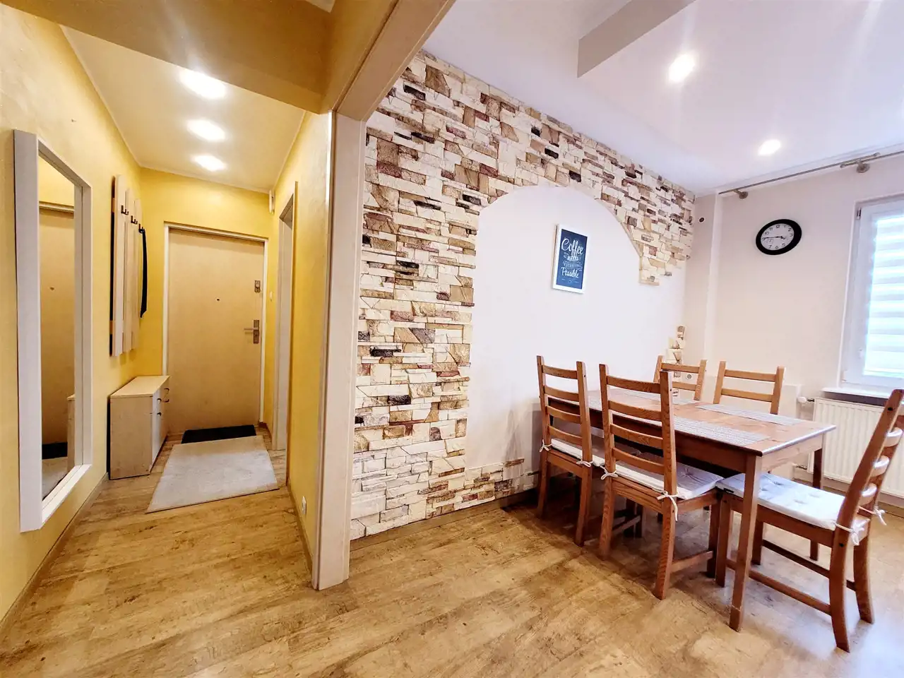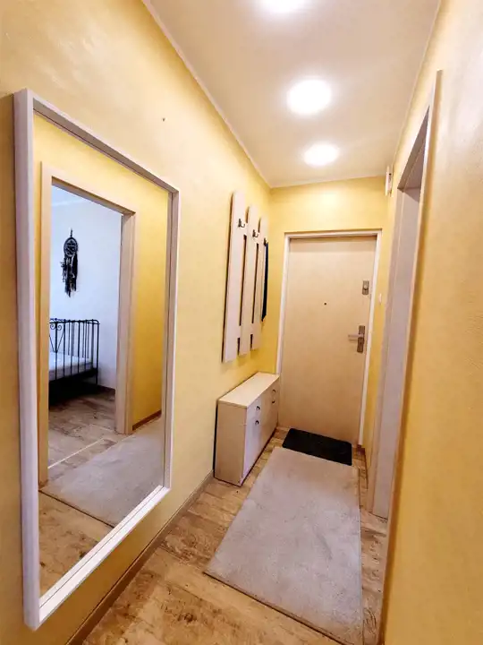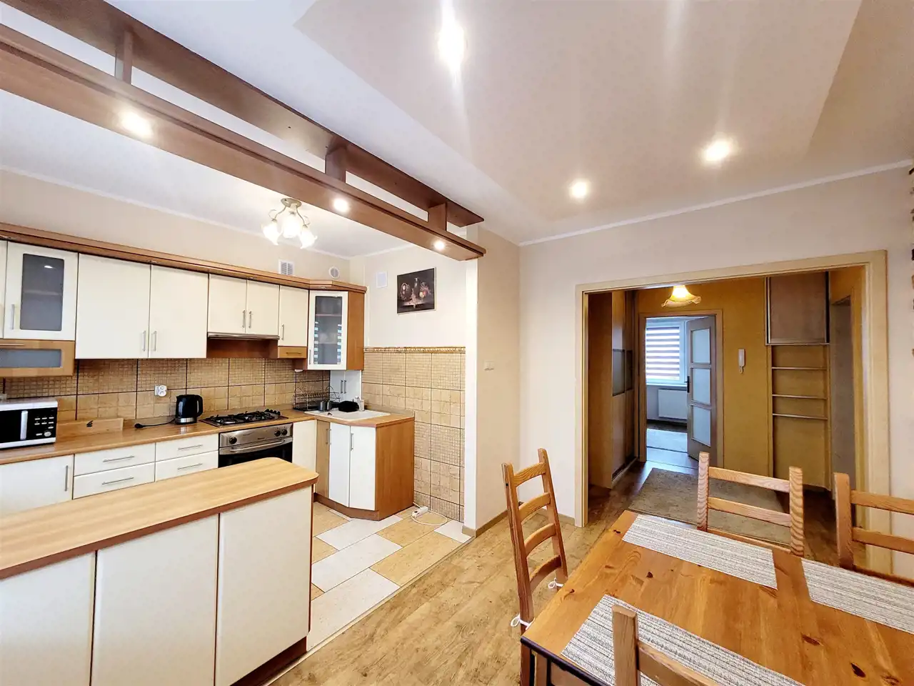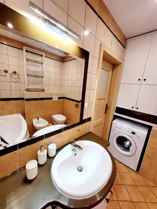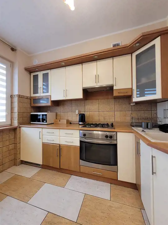 Mieszkanie urządzone i wyposażone w niezbędne sprzęty (kuchenka, lodówka, pralka) oraz wygodne i praktyczne meble.