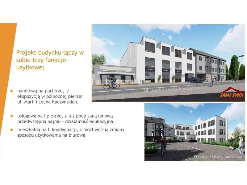 - handlową na parterze, z ekspozycją w północnej pierzei ul. Marii i Lecha Kaczyńskich,