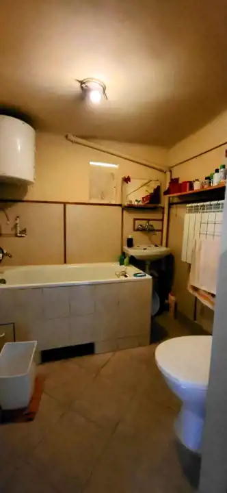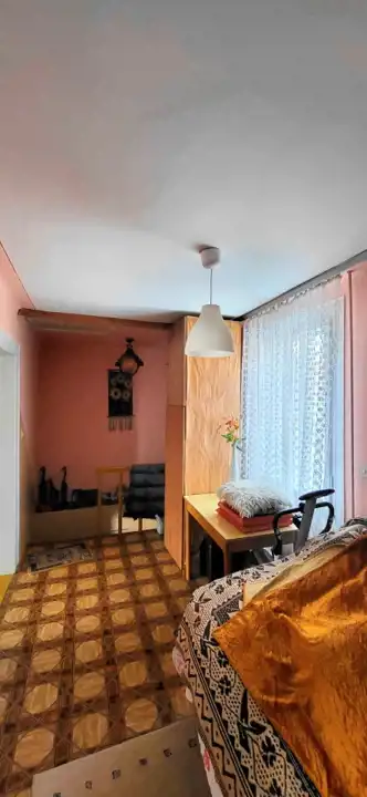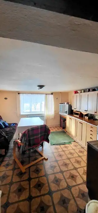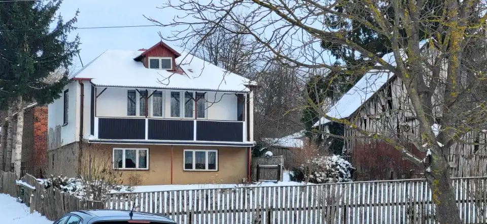Dom ma 100m2 i 2 kondygnacje- w przyziemiu jest kuchnia, łazienka z wanną i toaletą i niewielki pokoik; na piętrze są dwa pokoje.