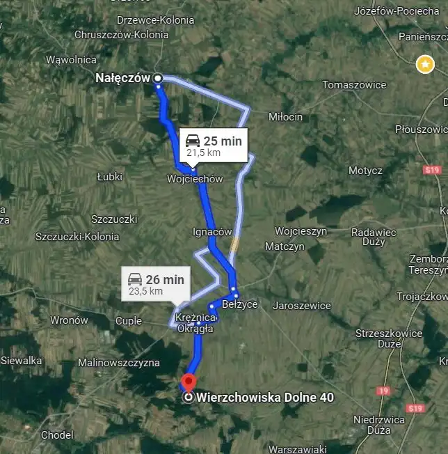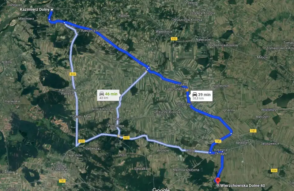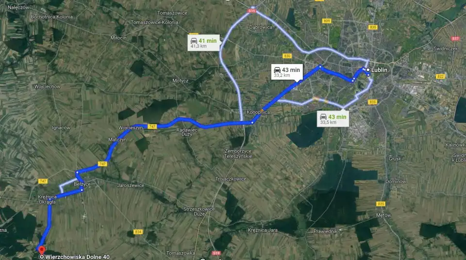 Odległości: od Bełżyc - ok. 6km, od Lublina - ok. 33km, od Nałęczowa - ok. 22km, od Kazimierza Dolnego - ok. 40km.