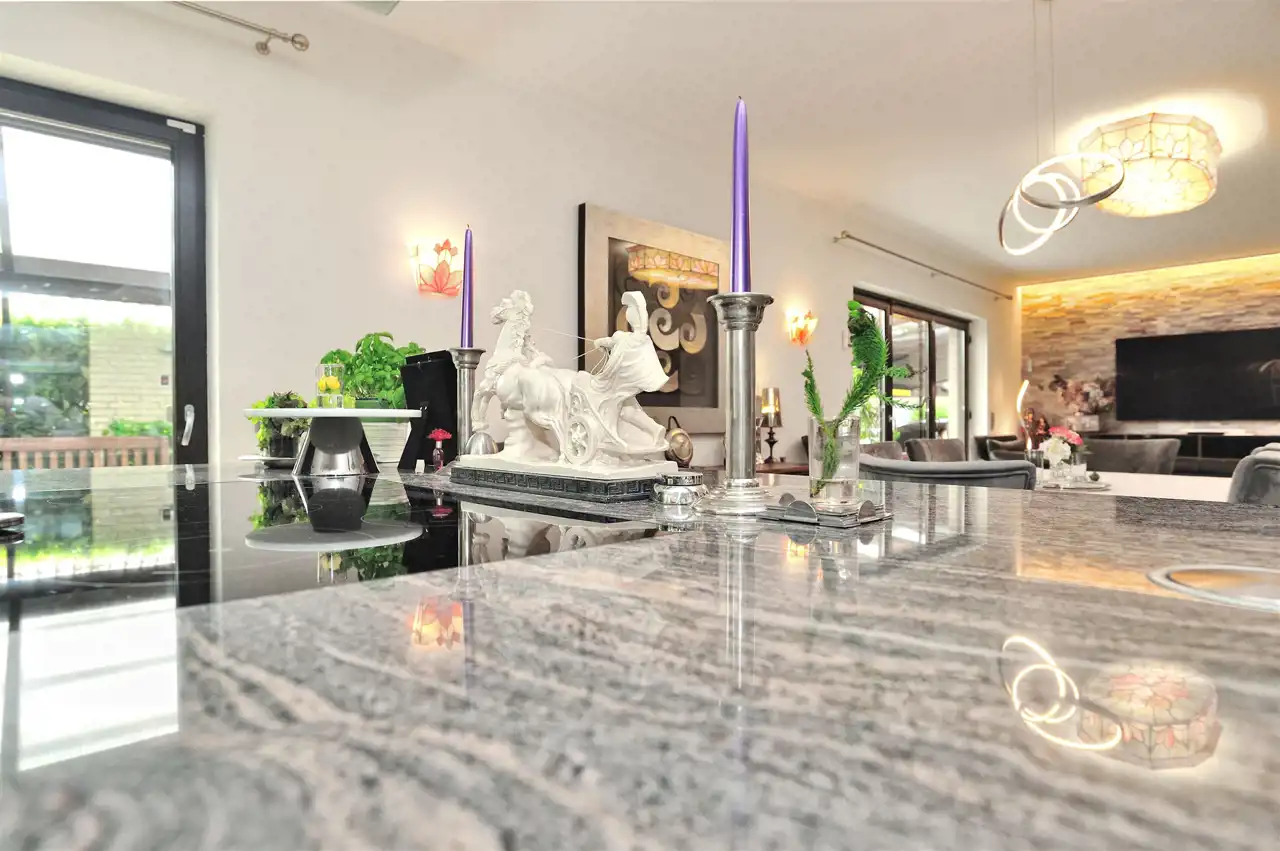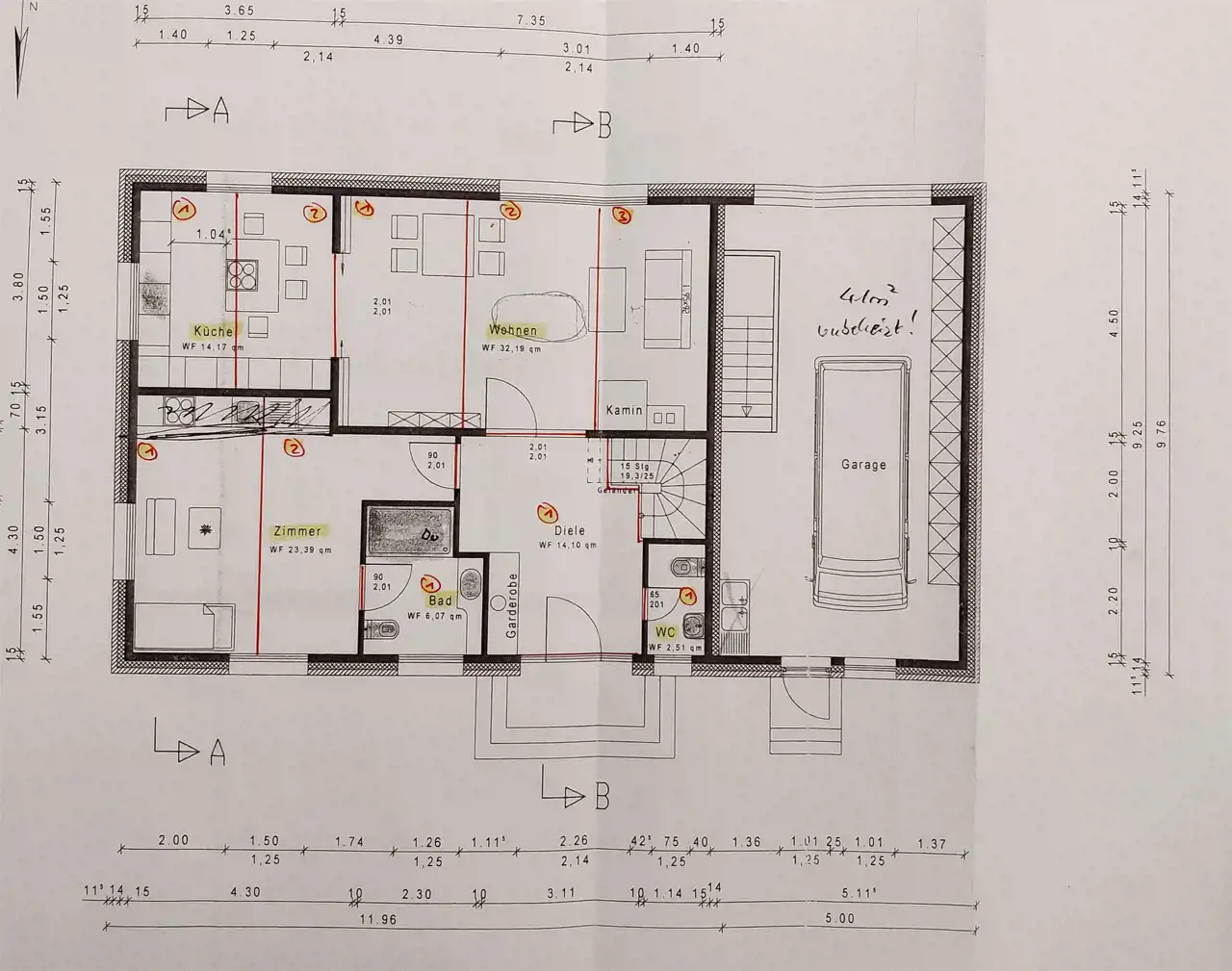 Erdgeschoss: Eingangsbereich, Garderobe, WC, Wohnzimmer mit Essbereich und Küche, Zugang zur Terrasse in Form eines Wintergartens, zusätzlich ein separates Schlafzimmer mit eigenem großen Badezimmer. Große Garage.
