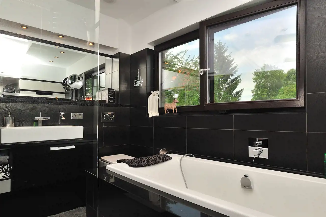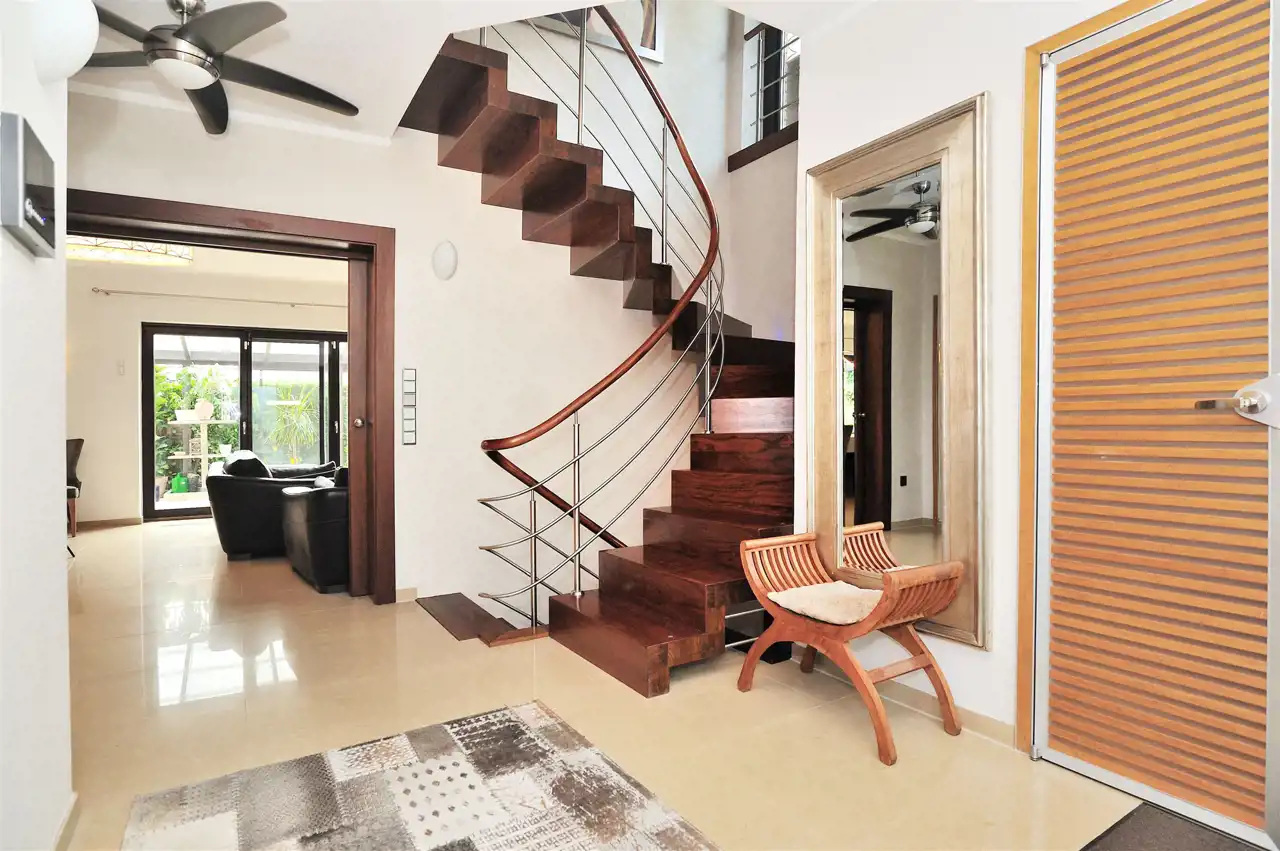 Hochwertige Fliesenböden, dreifach verglaste Holzfenster. Auf der Terrasse im Obergeschoss befindet sich ein großes Jacuzzi. Die Terrasse verfügt über ein elektrisch betriebenes, ausfahrbares Sonnendach.