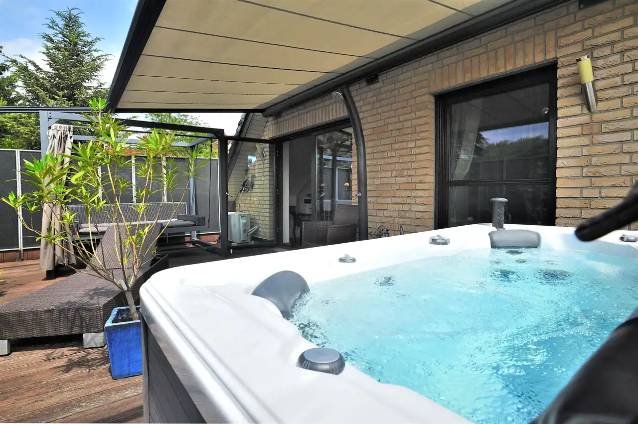 Na tarasie na piętrze duże jaccuzi. Taras z rozsuwanym elektrycznie materiałowym daszkiem przeciwsłonecznym.