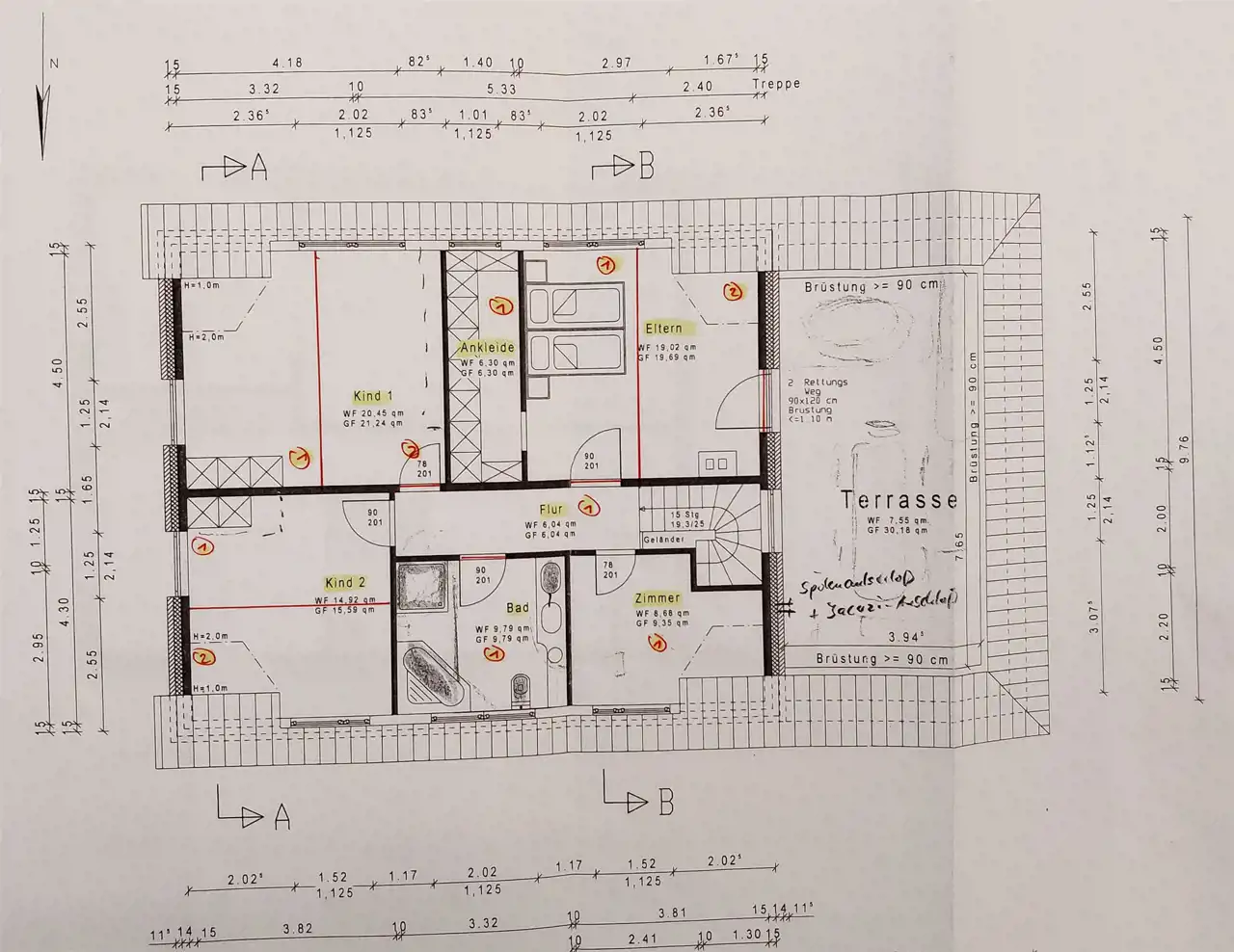 Obergeschoss: 3 Schlafzimmer, darunter ein Hauptschlafzimmer mit begehbarem Kleiderschrank, großes Badezimmer mit Badewanne und Dusche sowie eine über 30 Quadratmeter große Terrasse.