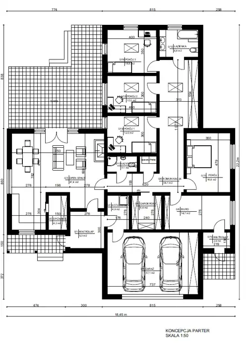 - projekt domu parterowego (powierzchnia 279 m2)