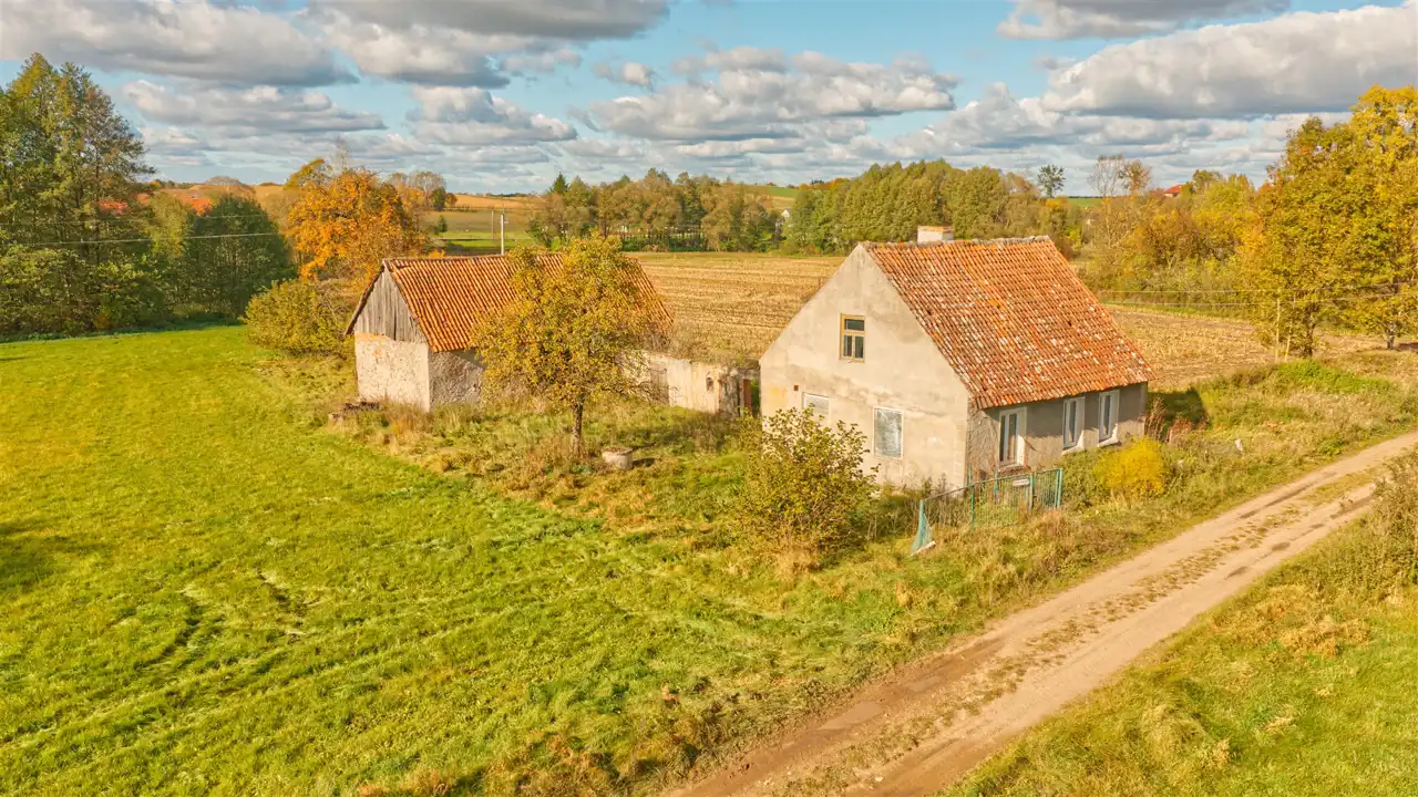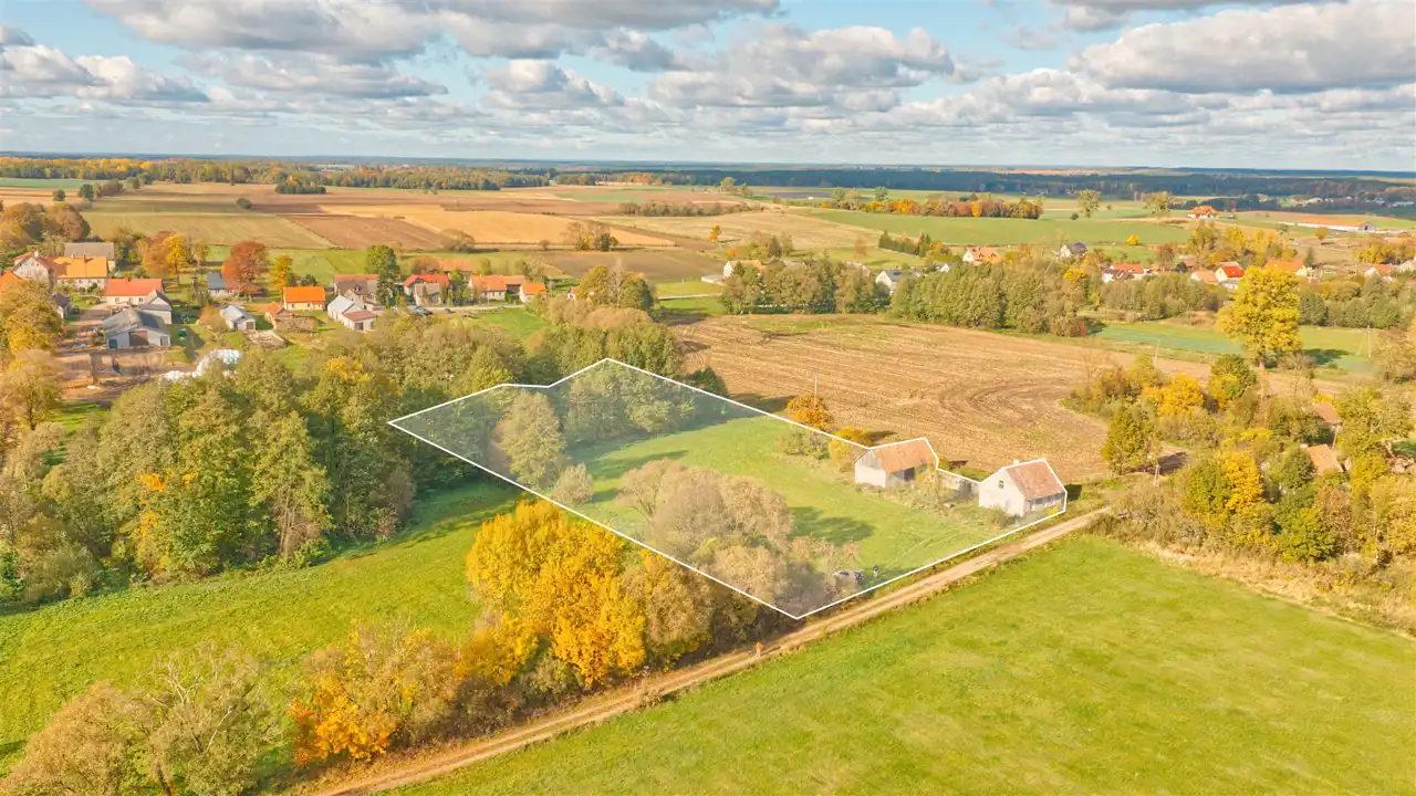Oferowana nieruchomość obejmuje dwa budynki – dom mieszkalny oraz budynek gospodarczy – a także pozostałości trzeciego budynku, który niegdyś łączył dom ze stodołą. Całość posadowiona jest na dwóch działkach gruntu o numerach ewidencyjnych 24/2 o powierzchni 1200 m² oraz 24/3 o powierzchni 8000 m², co łącznie daje 9200 m² powierzchni terenu.