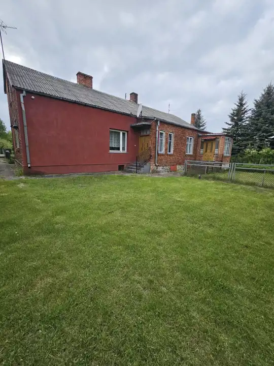Dom murowany, z czerwonej cegły, z podwójną ścianą ocieploną styropianem. Dach pokryty eternitem. Wewnątrz znajdują się okna drewniane z 1999r. Rozprowadzona instalacja hydrauliczna. Budynek podpiwniczony w całości, z łazienki schodzi się do piwnicy schodami drewnianymi. Tak znajduje się piec na węgiel. W części domu brak kaloryferów. W dwóch pokojach znajdują się piece kaflowe, które nie są używane. Budynek jest do generalnego remontu, co daje nowemu właścicielowi pełną swobodę w aranżacji wnętrz według własnych potrzeb.