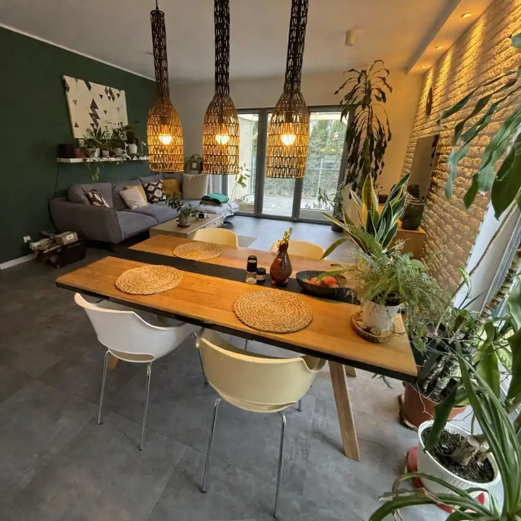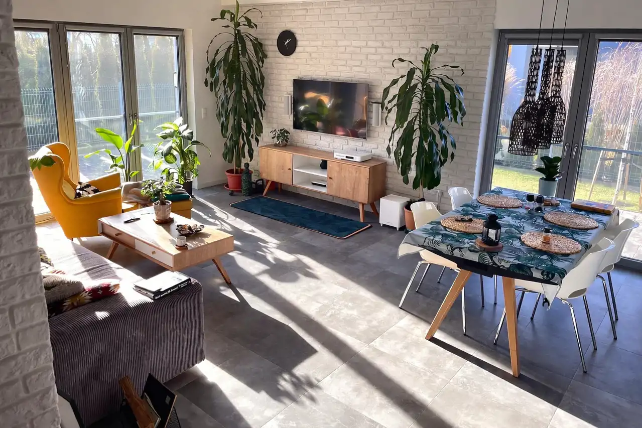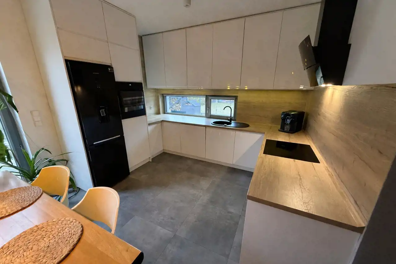 Wnętrze domu zostało wykończone w nowoczesnym, spójnym stylu z dbałością o detale. Centralną częścią jest jasny salon z aneksem kuchennym i wyjściem na taras, ozdobiony efektowną ścianą z białej cegły oraz dekoracyjnymi lamelami. W salonie znajduje się również klasyczny kominek, który tworzy przytulną atmosferę w chłodniejsze dni. Dom oferuje trzy komfortowe sypialnie, elegancką łazienkę z prysznicem, praktyczną garderobę oraz kotłownię. Dodatkowym atutem jest poddasze wyłożone płytą OSB (wysokość w szczycie ok. 2,5 m), które stanowi doskonałą przestrzeń magazynową.