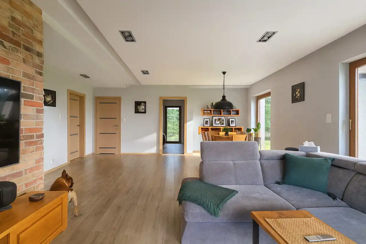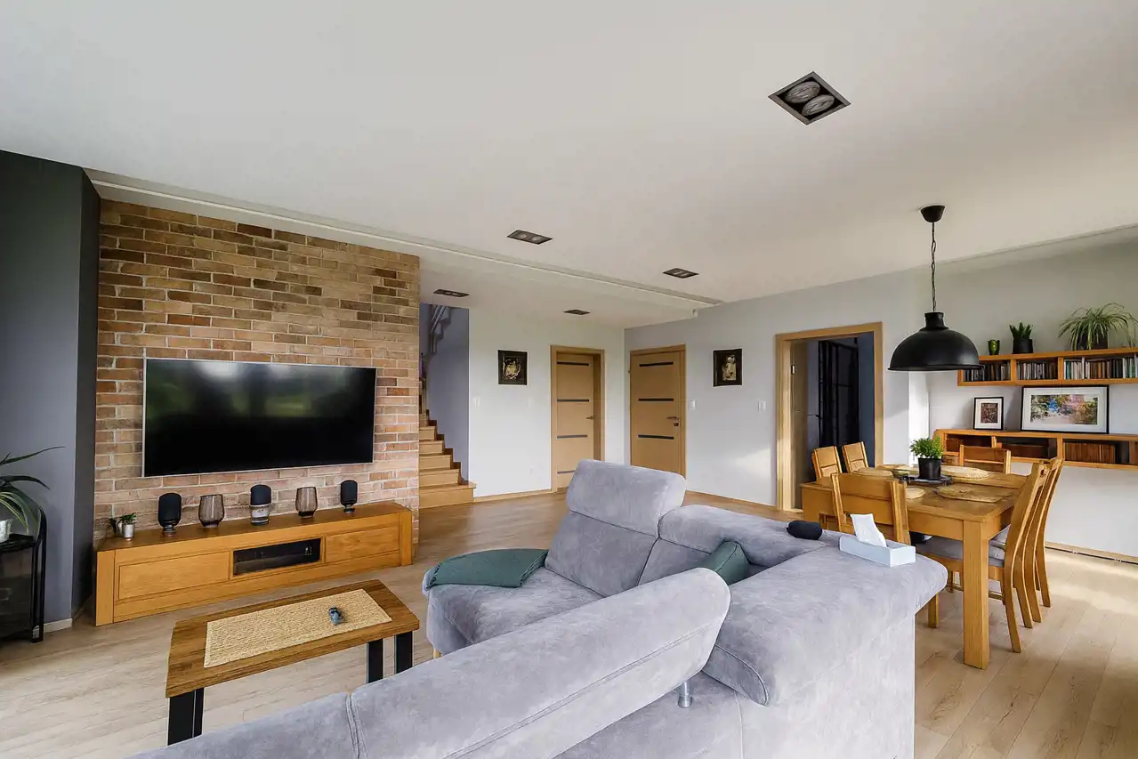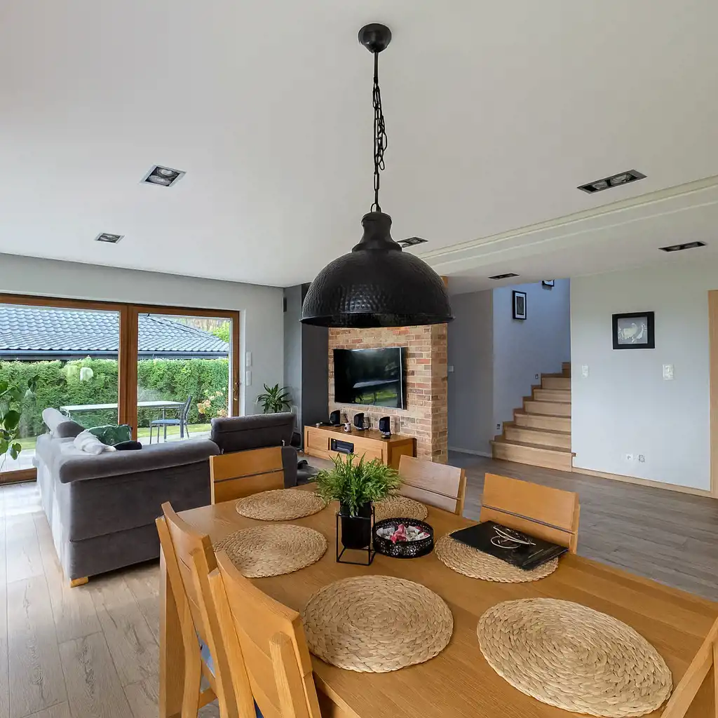 Jadalnia połączona z salonem — duża, wspólna przestrzeń dzienna.