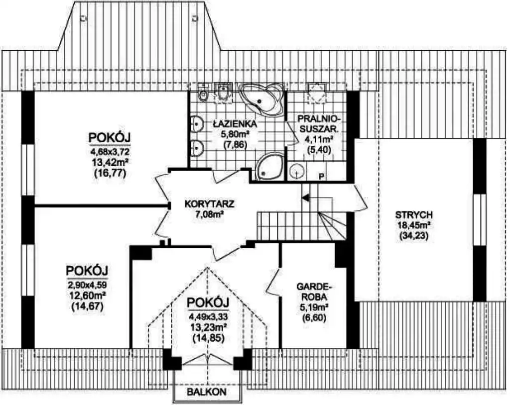 Na powierzchnie domu składa się: 6 pokoi w tym 3 sypialnie. Wymiary pomieszczeń na parterze: przedsionek (3.7 m2), hol (3.5 m2), łazienka (3m2), salon (36 m2), kuchnia (9,6m2), spiżarnia (2,7 m2), pokój/gabinet (12 m2), pom. gospodarcze (7,6 m2), garaż (21,5 m2) oraz pom. techniczne (8,2 m2); na poddaszu: hol (7 m2), sypialnia (14,8 m2) z garderobą (6m2) oraz balkonem, 2 sypialnie (14,6 m2) (13,4 m2), łazienka (7,8 m2), pralnio-suszarnia (5,4 m2) oraz osobna przestronna garderoba (30,3 m2).