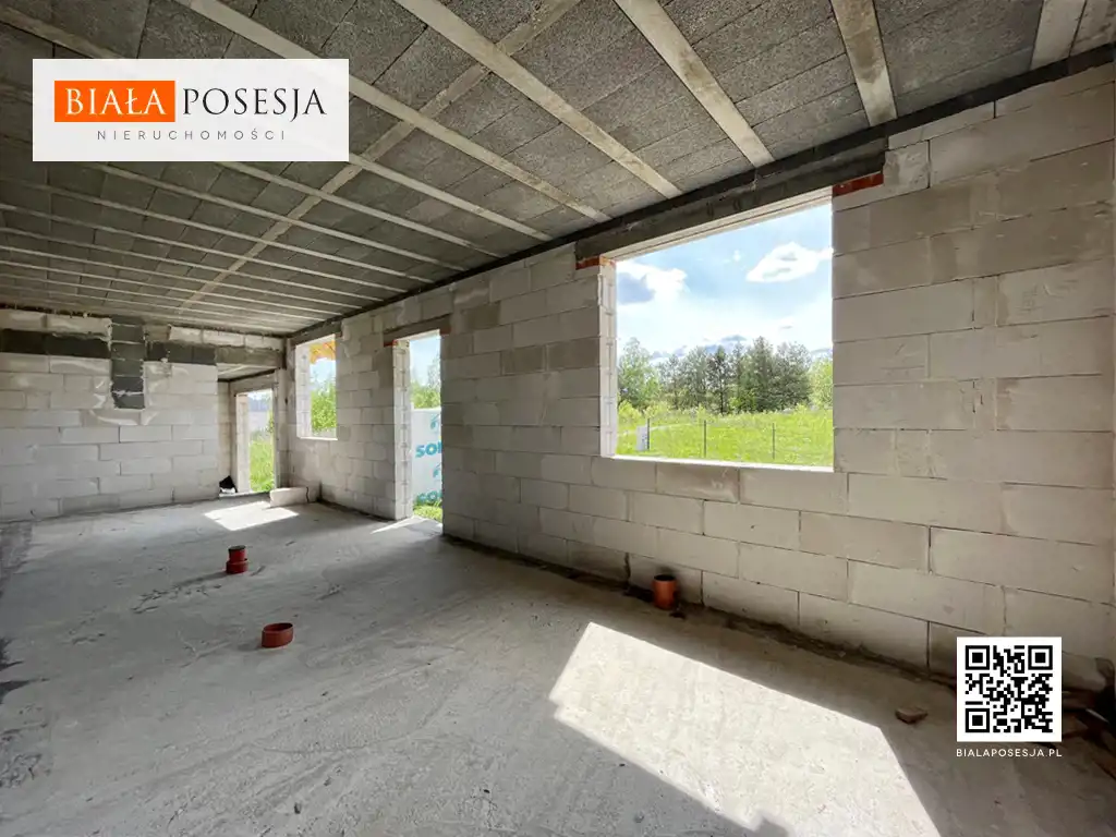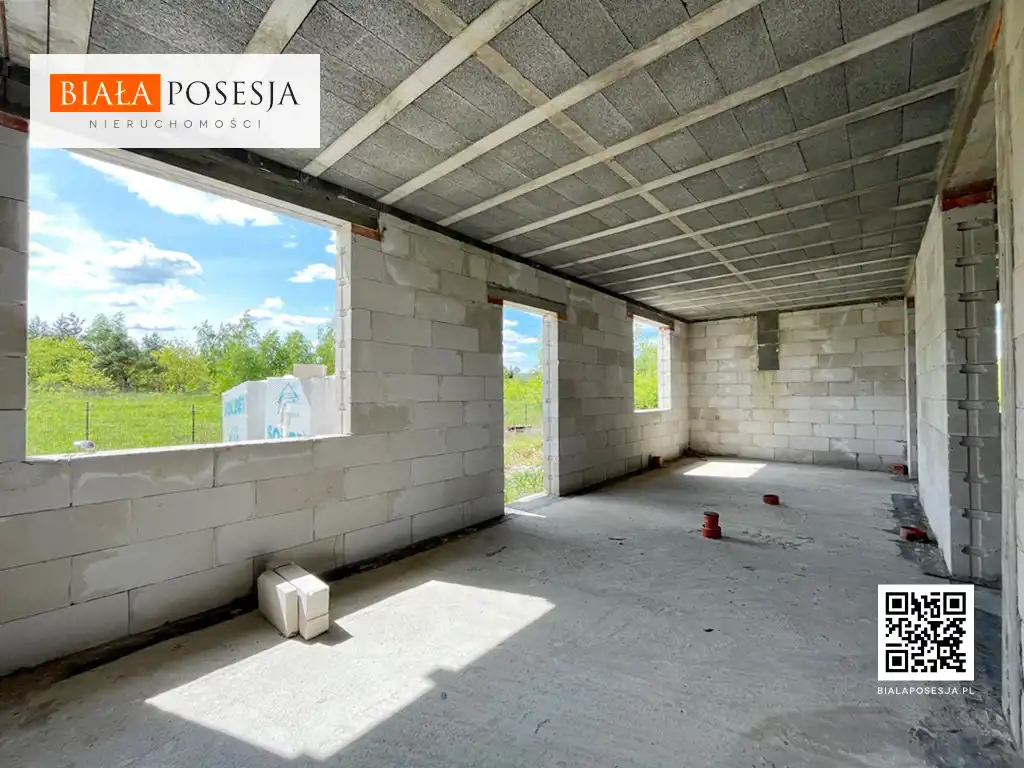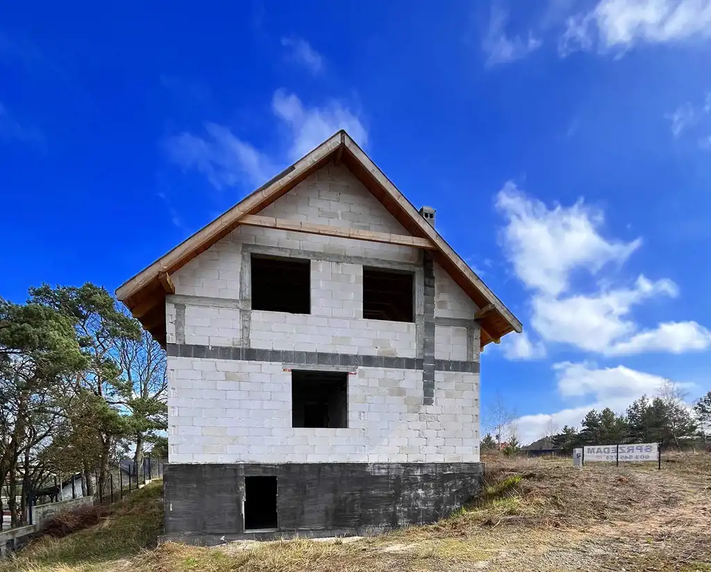 Etap budowy to stan surowy otwarty, według projektu - Nasturcja 2 - prosta bryła, zwieńczona dwuspadowym dachem, cały dom podpiwniczony.