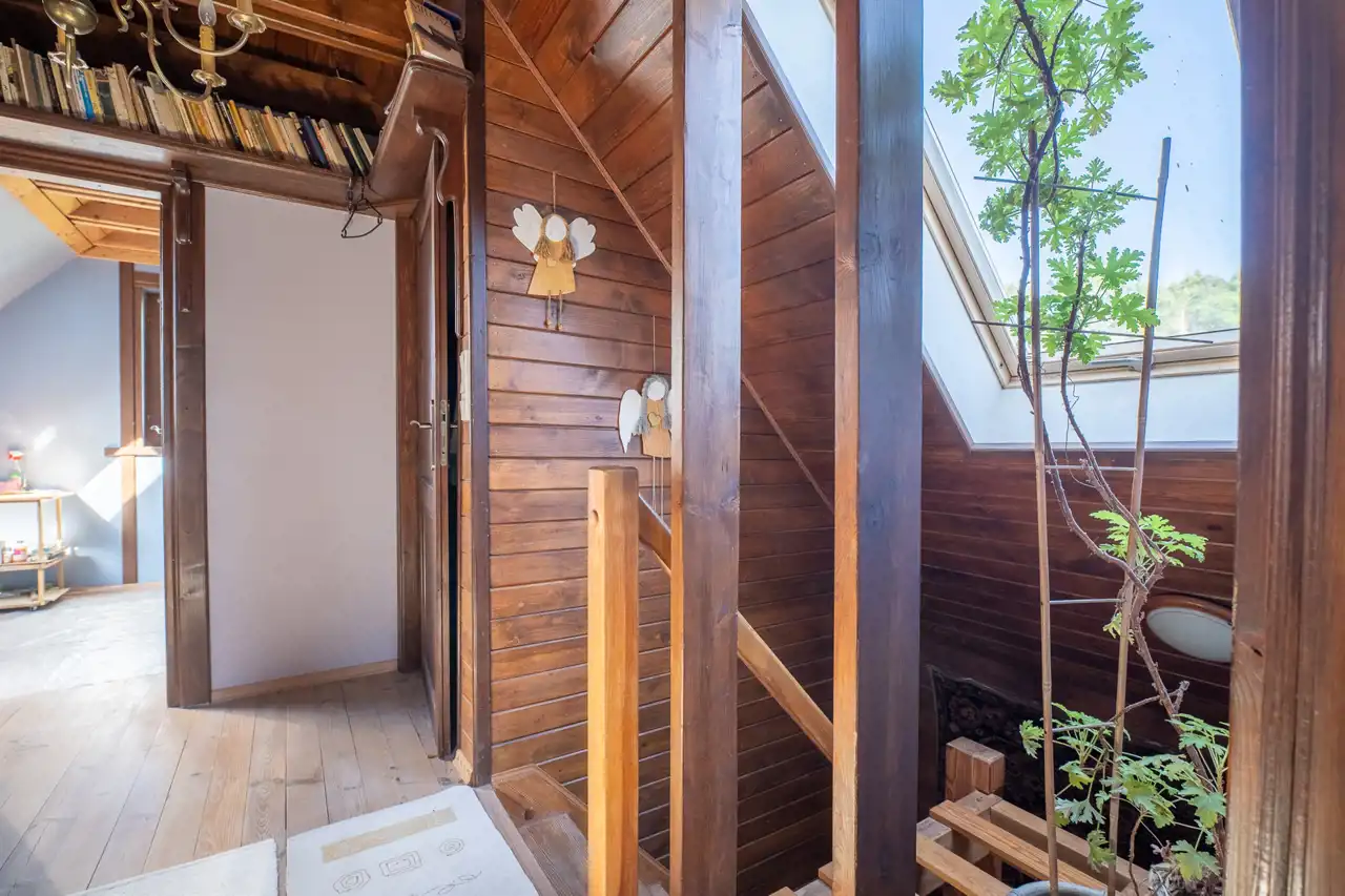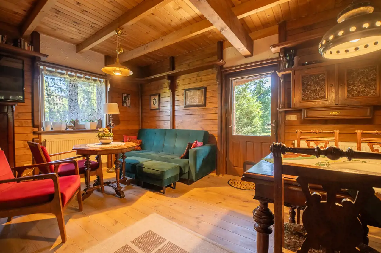 Powierzchnia działki wynosi 849 m2, rozkłada się w kształcie prostokąta. Teren działki jest zagospodarowany, ogrodzony deskami ogrodzeniowymi. 2 budynki ustawione są w jednej linii, tworząc wrażenie dużo większej przestrzeni, którą oferuje działka. Teren gęsto zagospodarowany w nasadzenia, kwiaty, krzewy i drzewa, które wraz z innymi walorami estetycznymi - budynki z drewna, ścieżki z kamieni - odpowiadają za budowanie niezwykłego klimatu nieruchomości.