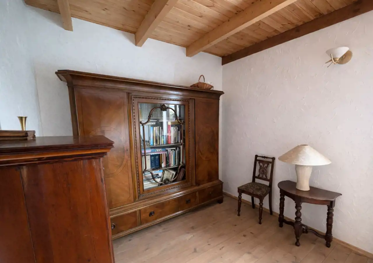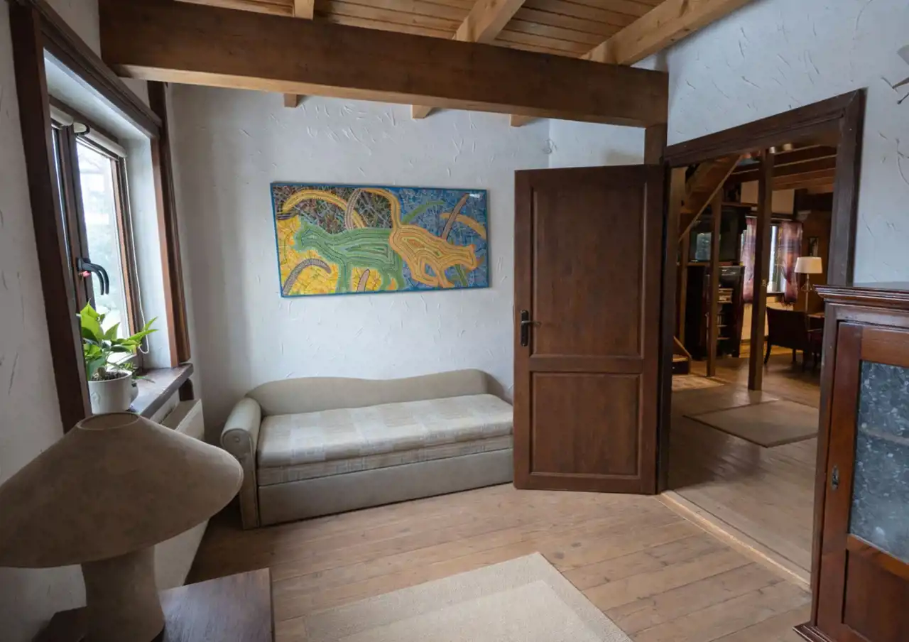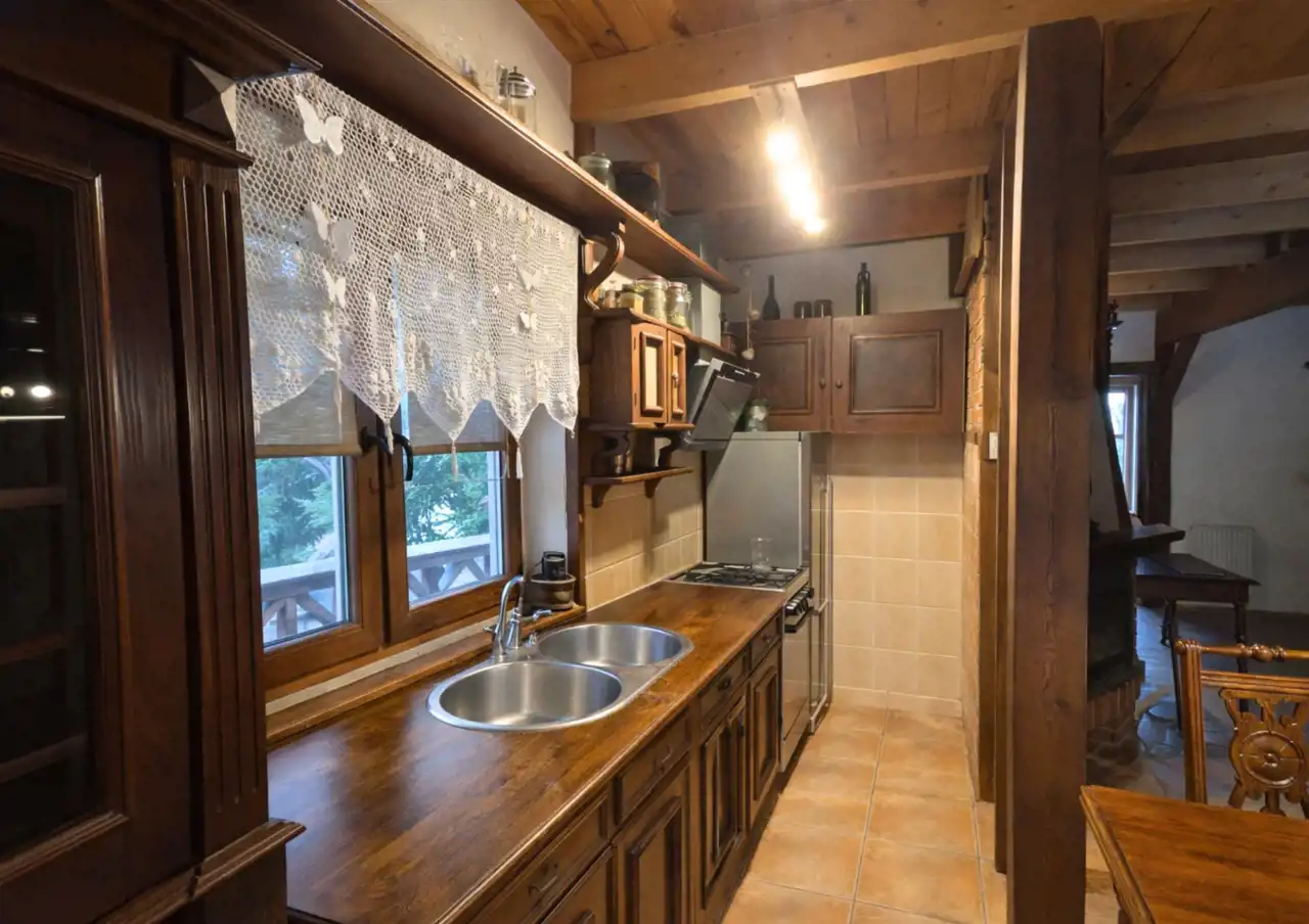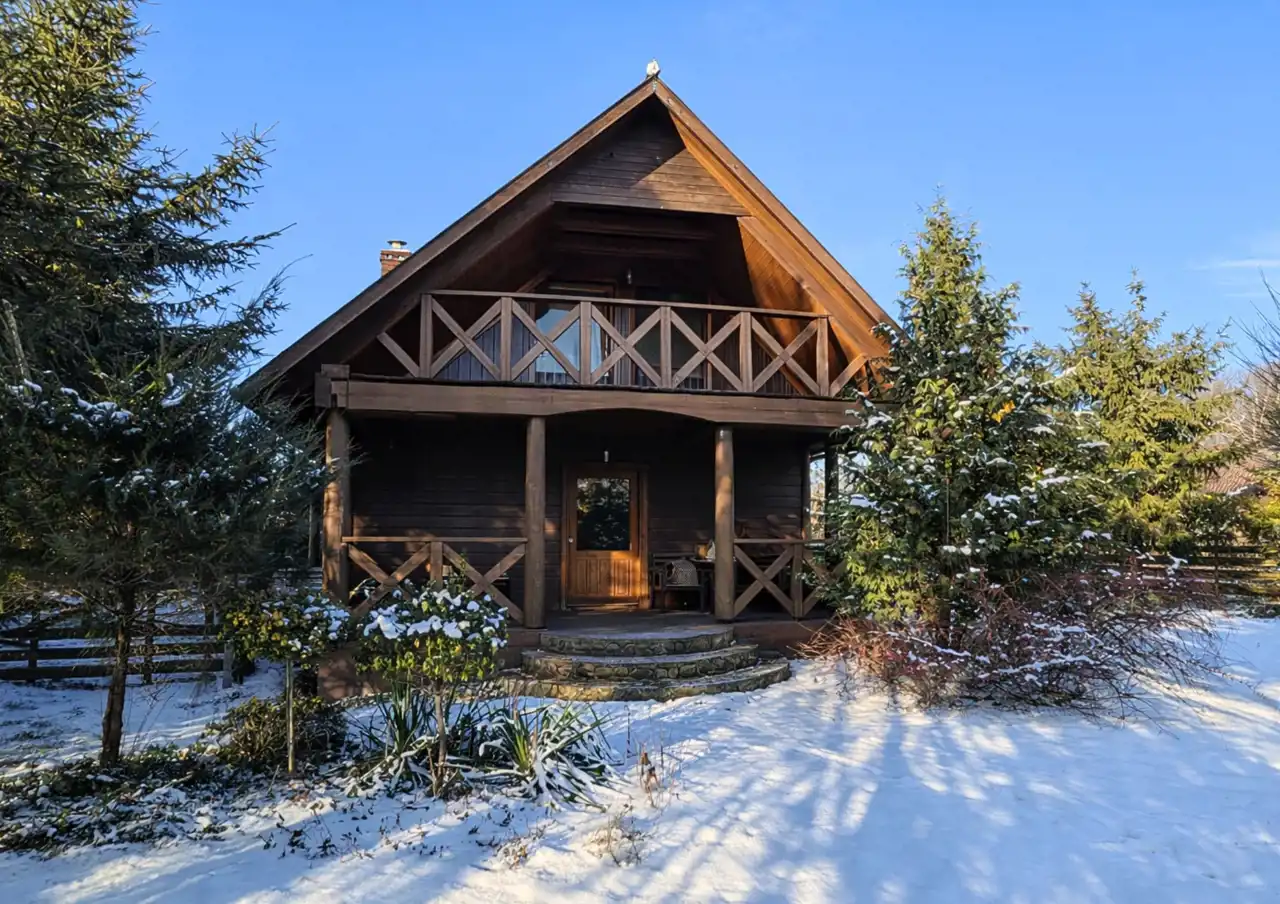 Na działce znajduje się również wolnostojący budynek garażowo-gospodarczy o powierzchni 39 m² z wiatą, ogrzewany z tego samego źródła co dom. Teren jest w pełni ogrodzony drewnianym ogrodzeniem i starannie zagospodarowany – liczne nasadzenia, drzewa, krzewy oraz kamienne ścieżki tworzą niepowtarzalny, klimatyczny charakter posesji.