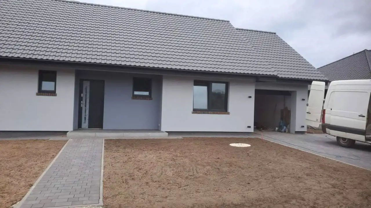 Dom wybudowany w 2025 roku, 4 pokoje, aneks kuchenny, taras, garaż, dojazd drogą utwardzoną.