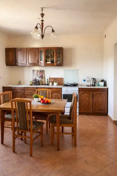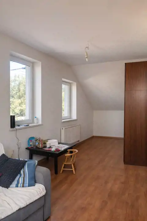 W budynku znajduje się salon z aneksem kuchennym , 5 pokoi, z możliwością wydzielenia szóstego pokoju, co daje duży potencjał aranżacyjny. Do dyspozycji są również 2 łazienki — jedna została już wykończona, natomiast druga pozostaje do własnej aranżacji, co pozwala dostosować ją do indywidualnych potrzeb. Dom posiada garaż jednostanowiskowy.