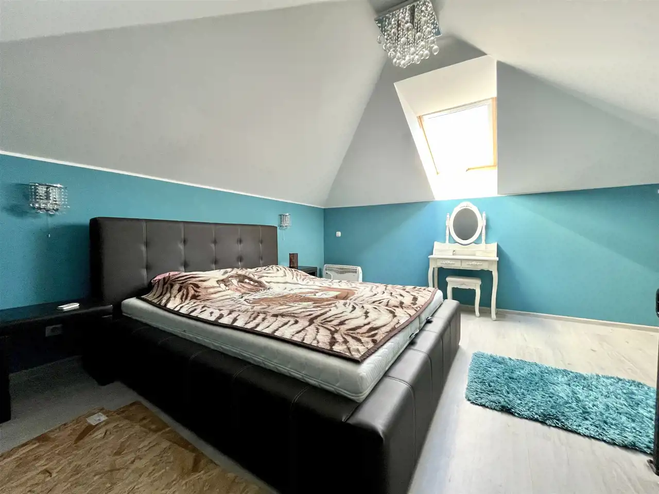 Na parterze znajduje się przestronny salon otwarty na kuchnię, 3 sypialnie, łazienka, wc, korytarz z którego jest przejście do garażu. Na poddaszu jeden duży pokój.