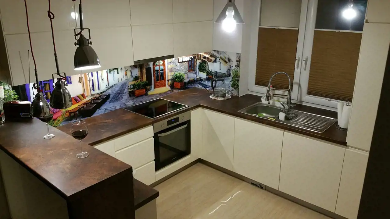 kuchnia otwarta na salon w zabudowie wraz ze sprzętem AGD.
