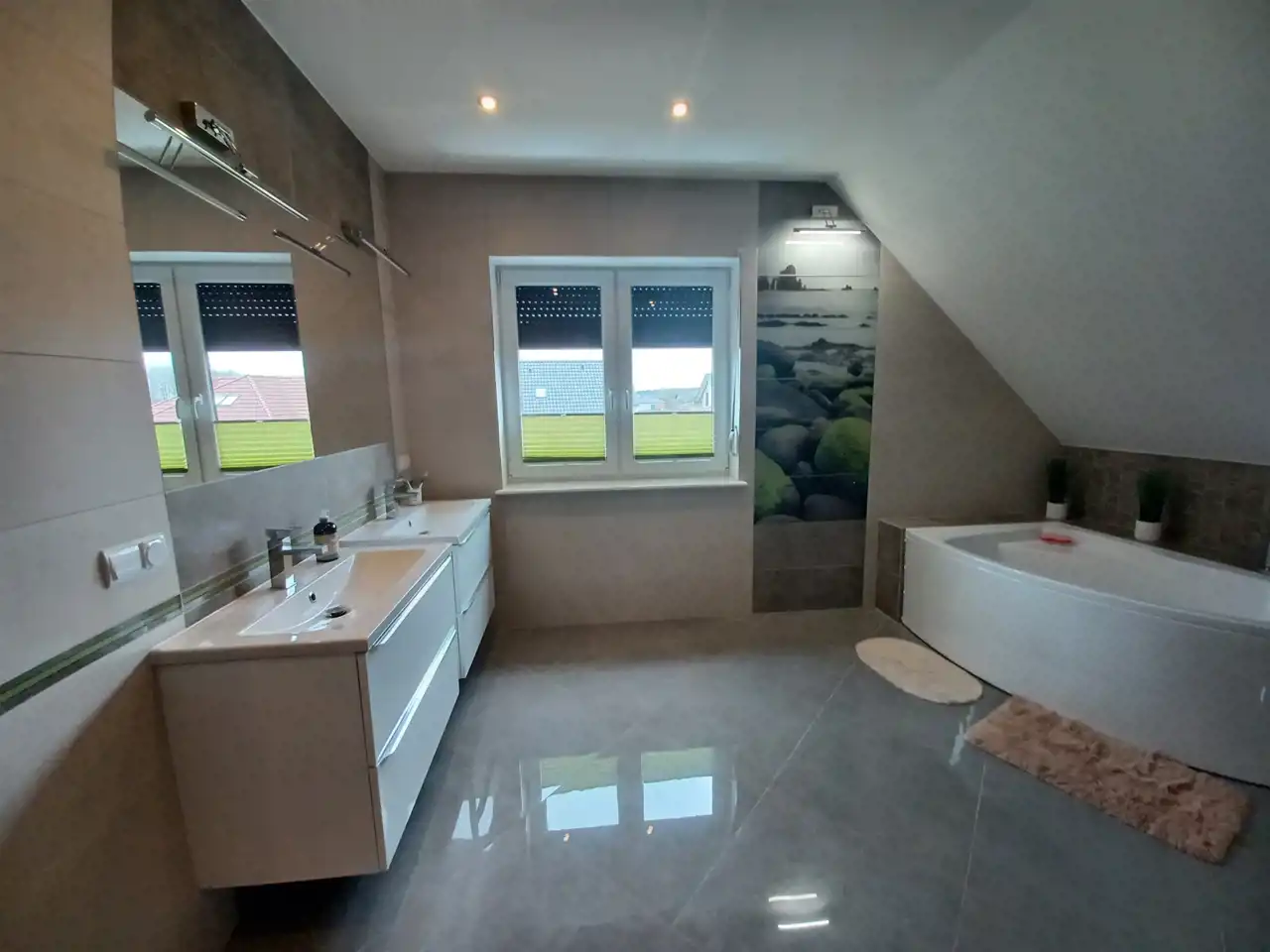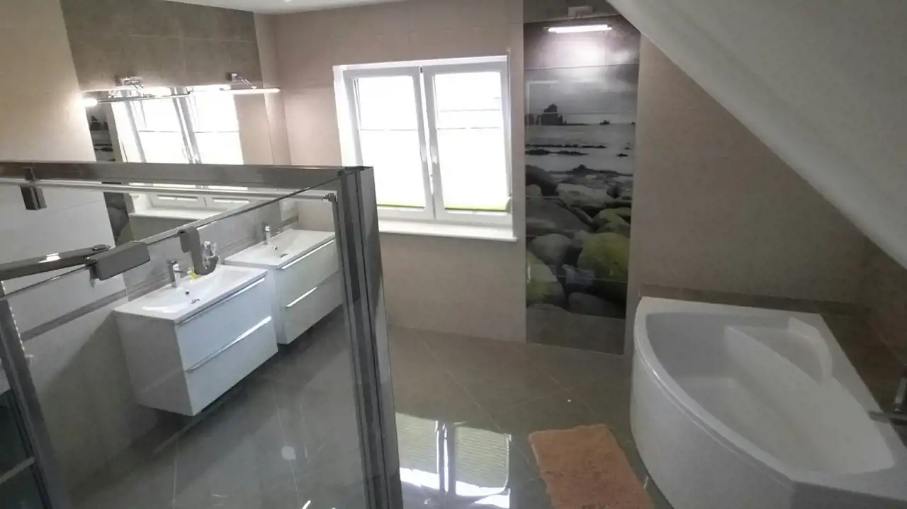 Pokój kąpielowy z oknem, dwiema umywalkami, wanną oraz dużą kabiną prysznicową.