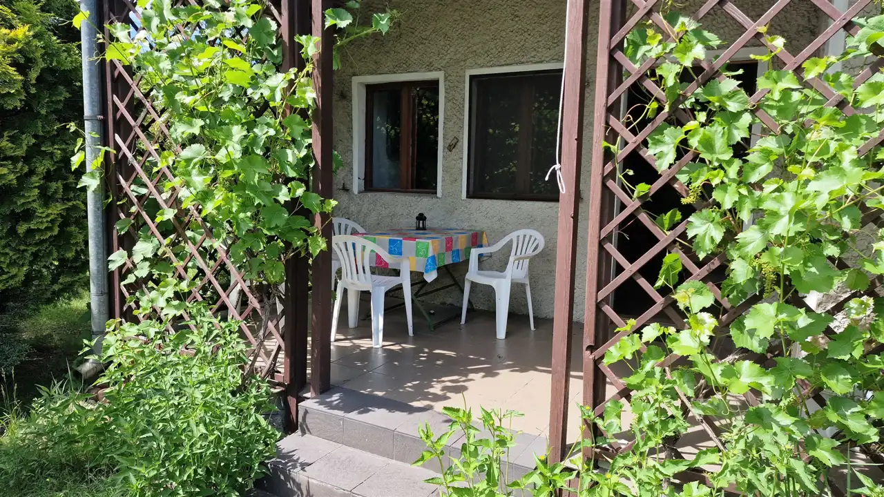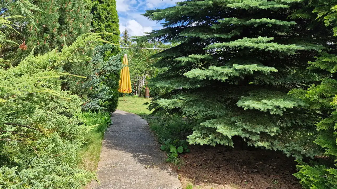 Na działce wiele nasadzeń, orzech włoski, jabłonie, winogrono oraz krzewy iglaste.