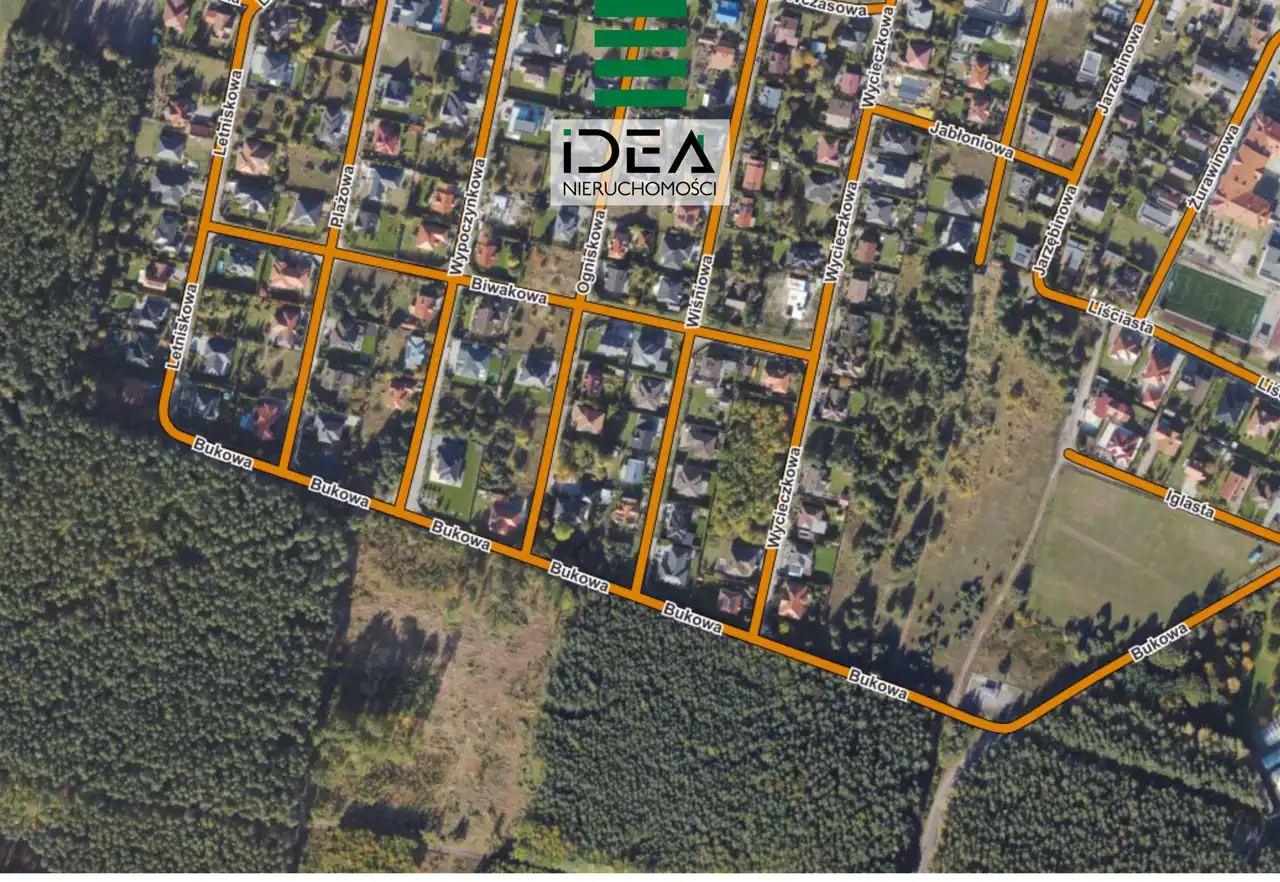 Działka sąsiaduje z lasem, osiedle domów jednorodzinnych.