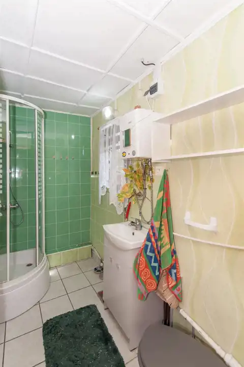 Okna PCV, kafle na podłodze, ściany w drewnianej klepce, która nadaje przytulny, wakacyjny klimat.