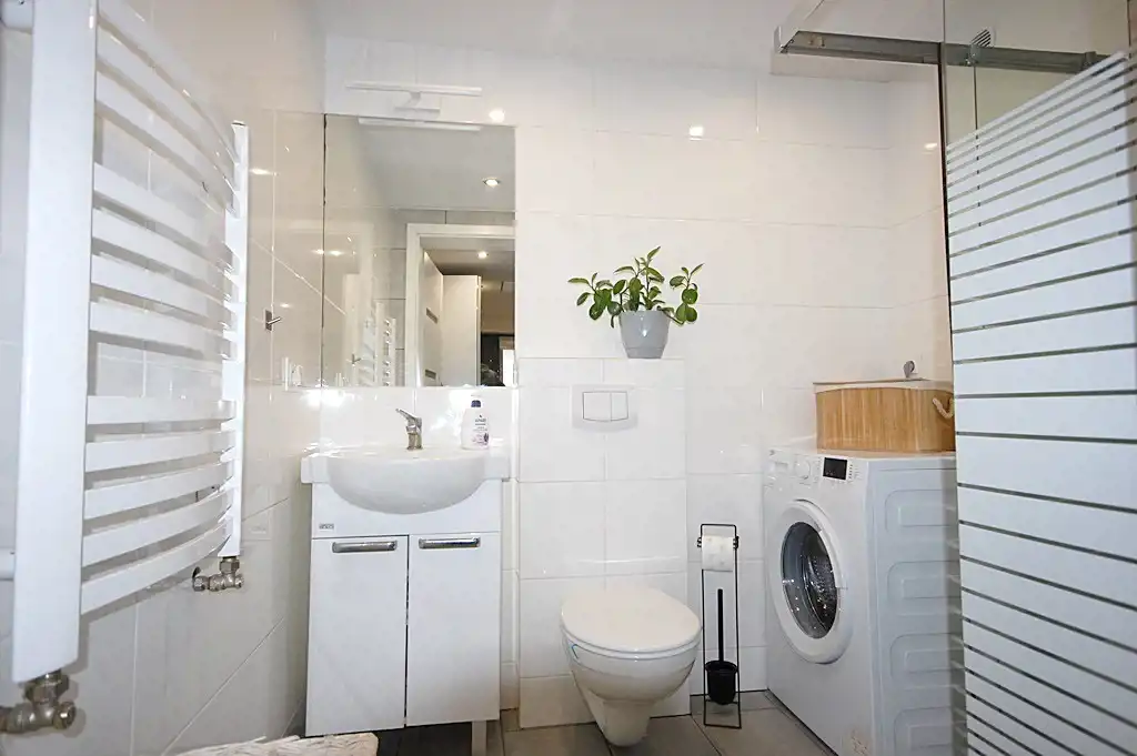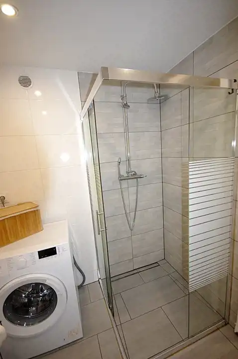Łazienka-ok 4,30m2,podłoga terakota,ogrzewanie podłogowe+grzejnik drabinkowy,ściany w całości pokryte glazurą,kabina prysznicowa