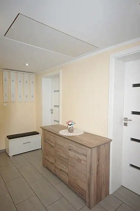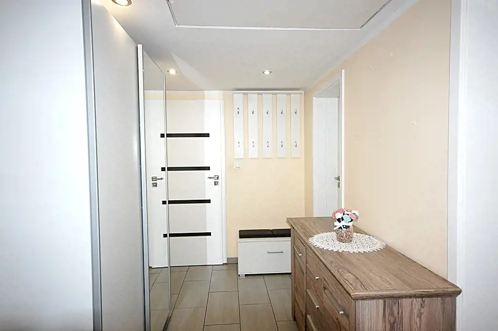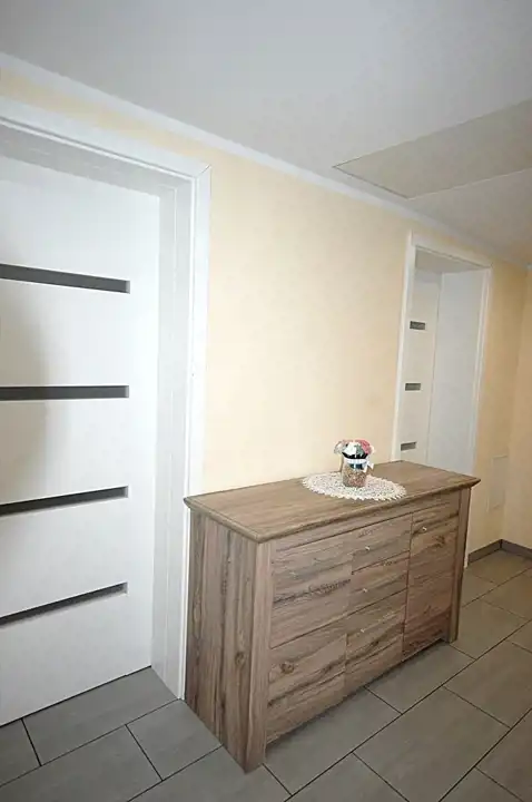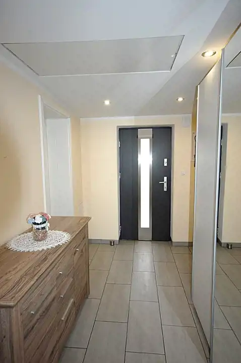 Przedpokój-ok 9,50 m2 podłoga terakota-ogrzewanie podłogowe,ściany gipsowane-malowane+płyty kartongips,w cenie wolnostojąca szafa,szafka na buty i wieszak,oświetlenie sufitowe-halogenowe
