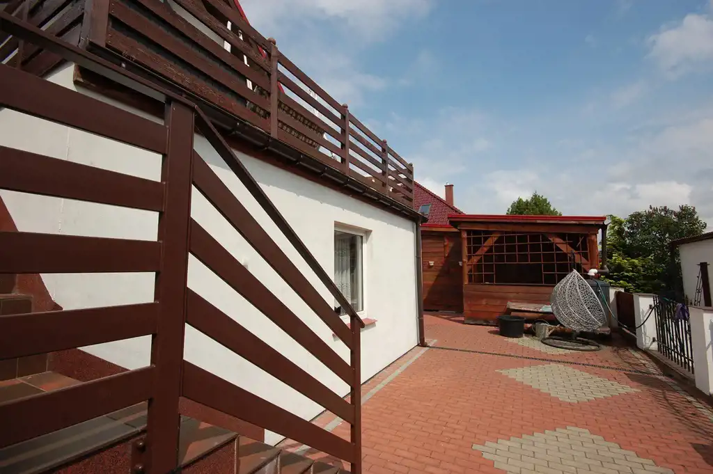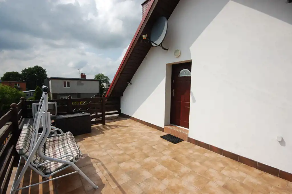Taras ok 22m2, podłoga terakota, balustrada drewniana, wejście do części mieszkalnej na poddaszu poprzez taras.