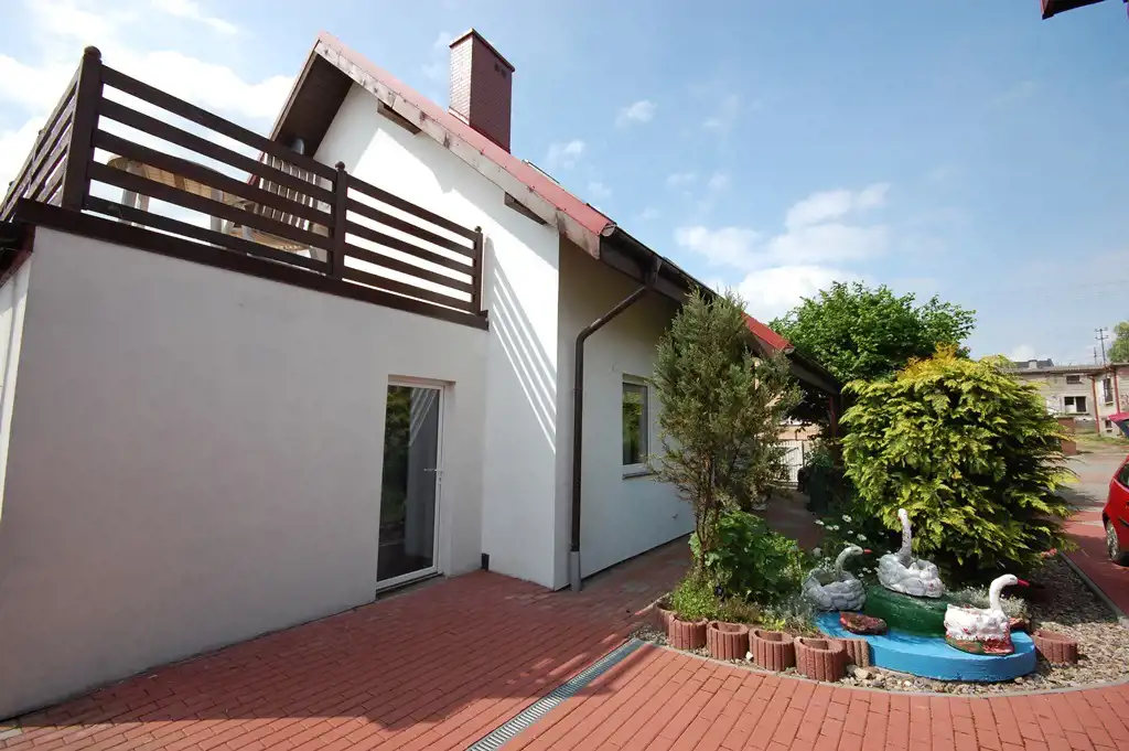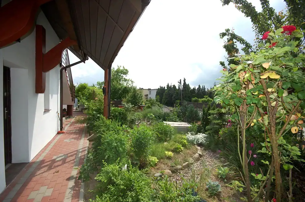 Działka bardzo zadbana, liczne nasadzenia krzewów, kwiatów, drzew. Wyodrębniony warzywnik. Wjazd na działkę do garażu i opaska wokół budynku wykonana w kostce brukowej. Ogrodzenie częściowo betonowe, częściowe metalowe-kute.