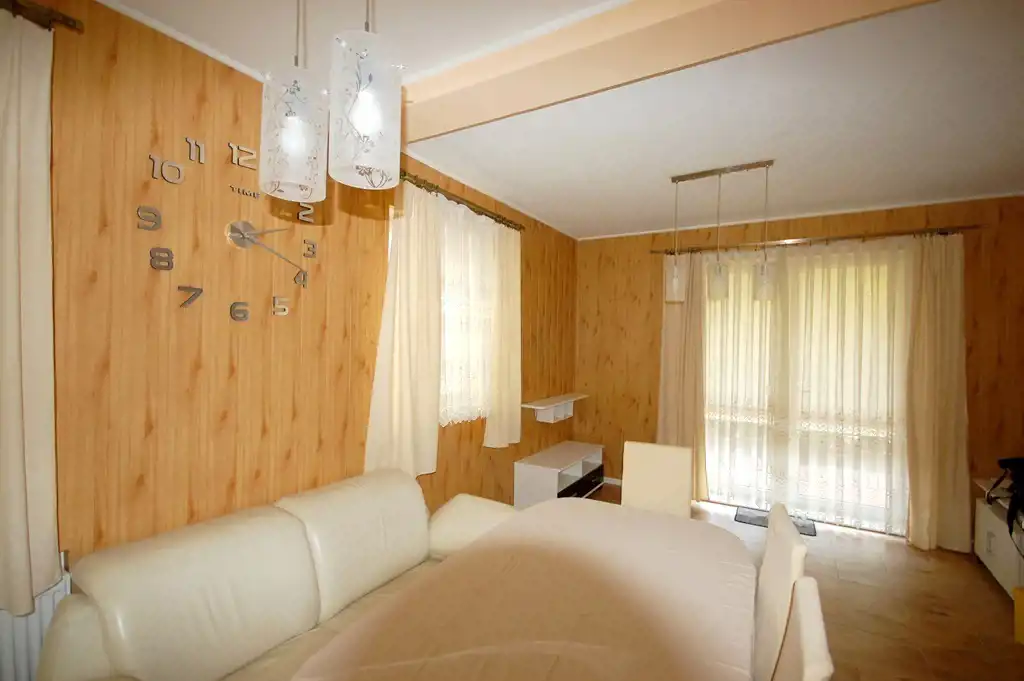- salon z aneksem kuchennym pow.ok 34,05 m2, podłoga pokryta terakotą, ściany gipsowane-malowane, w części pokryte panelami ściennymi, salon wyposażony w czynny kominek z wyprowadzeniami przewodów ciepła na część poddaszową, w części kuchennej ściany pokryte glazurą, tradycyjna zabudowa kuchenna z kuchenką gazową Beko i pochłaniaczem Ciarko w cenie.