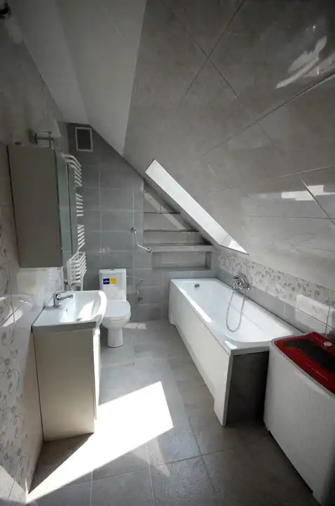 - łazienka ok 7,25 m2 (użytkowa ok 4,30 m2 ), podłoga terakota, glazura na całości ścian, wanna, okno połaciowe.
