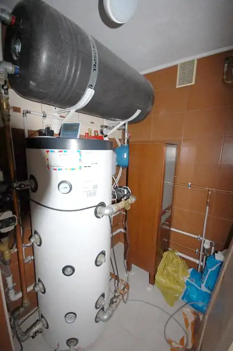 - pomieszczenie gospodarcze (wejście z pokoju) ok 3,45 m2, pompa ciepła, zasobnik wody, filtry - całość oprzyrządowania do obsługi pompy ciepła.