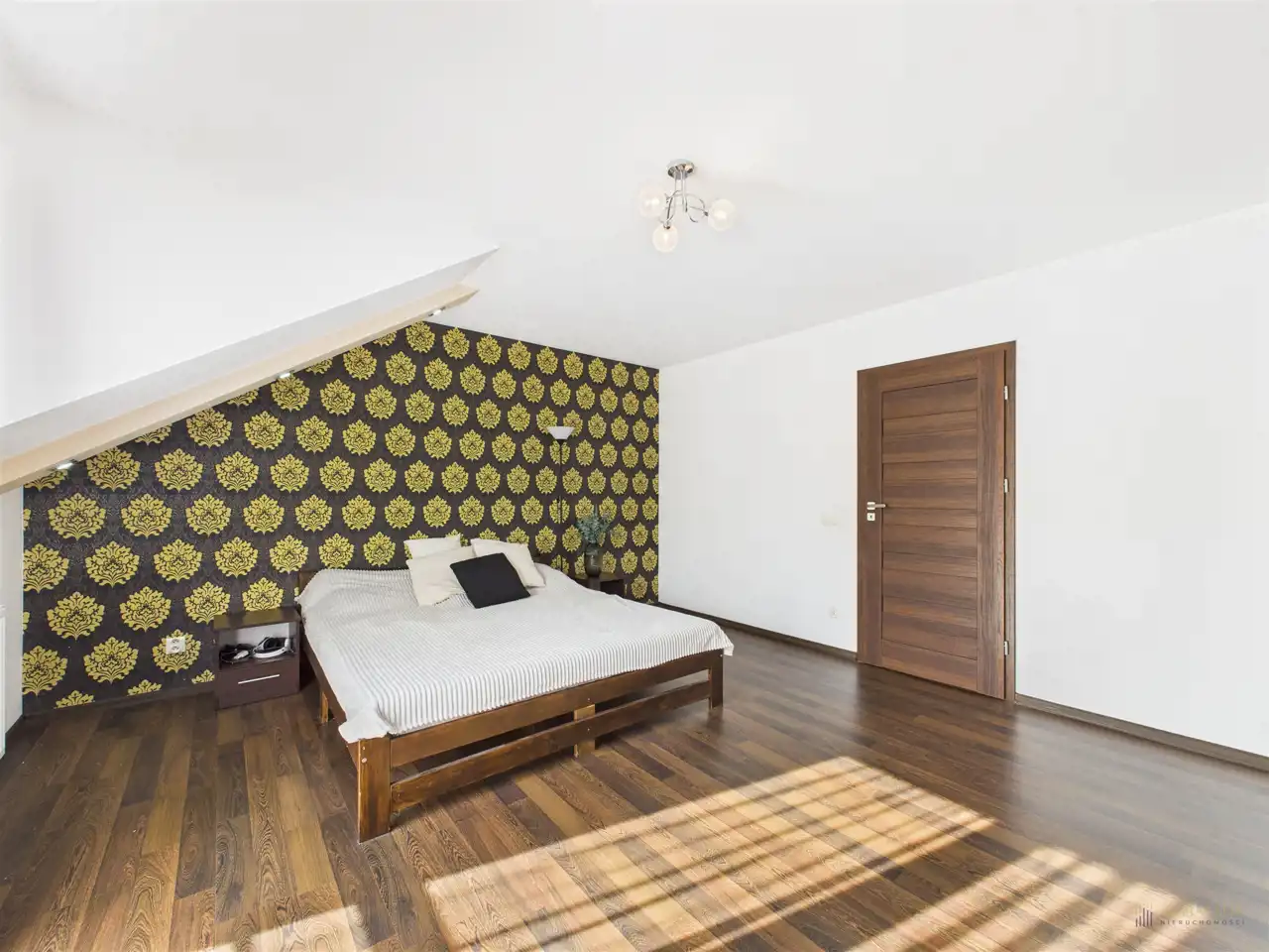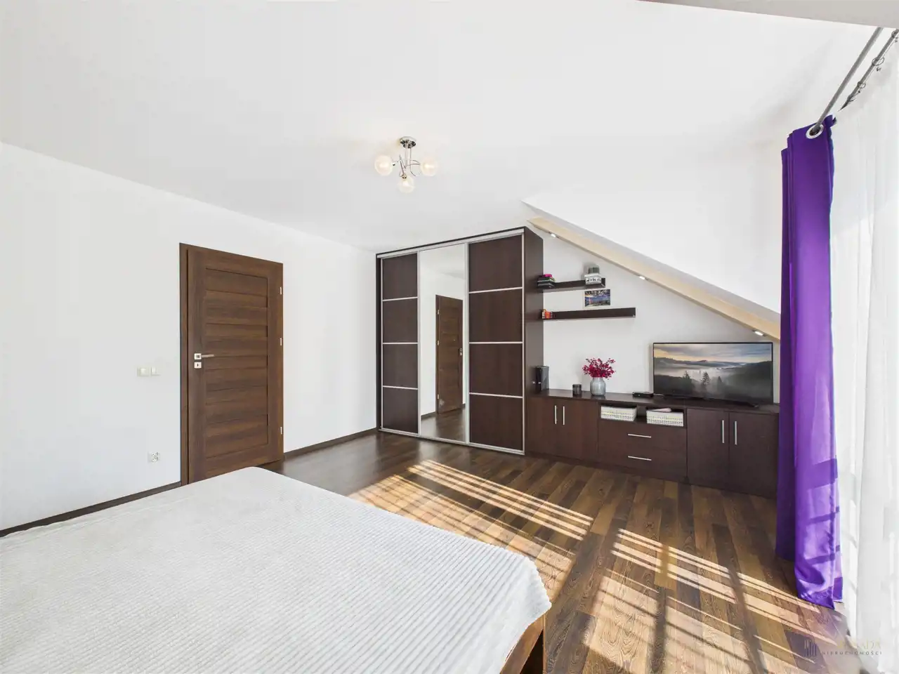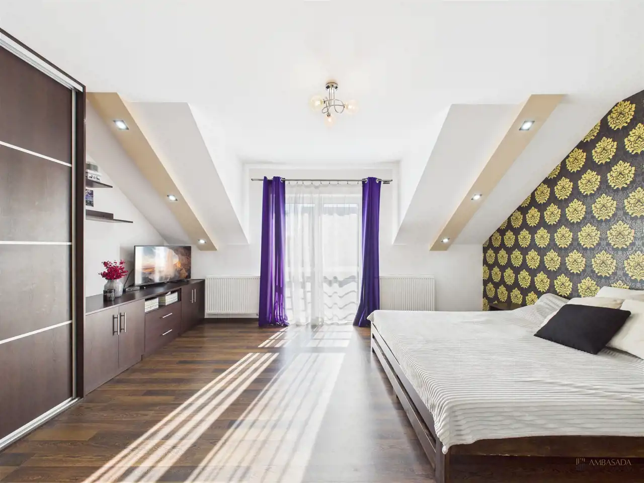 - Piętro – trzy sypialnie, duża łazienka z wanną i prysznicem, garderoba oraz dwa balkony.