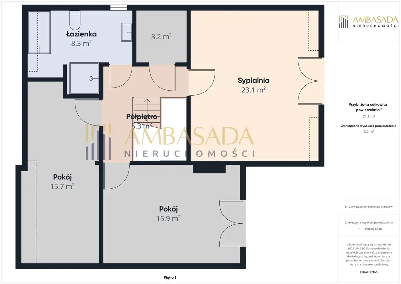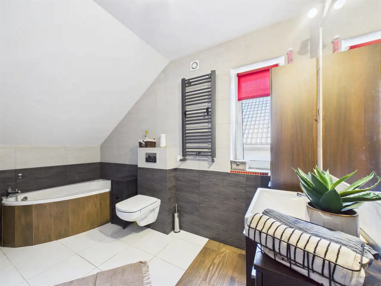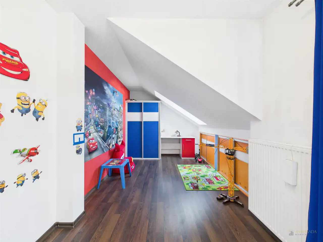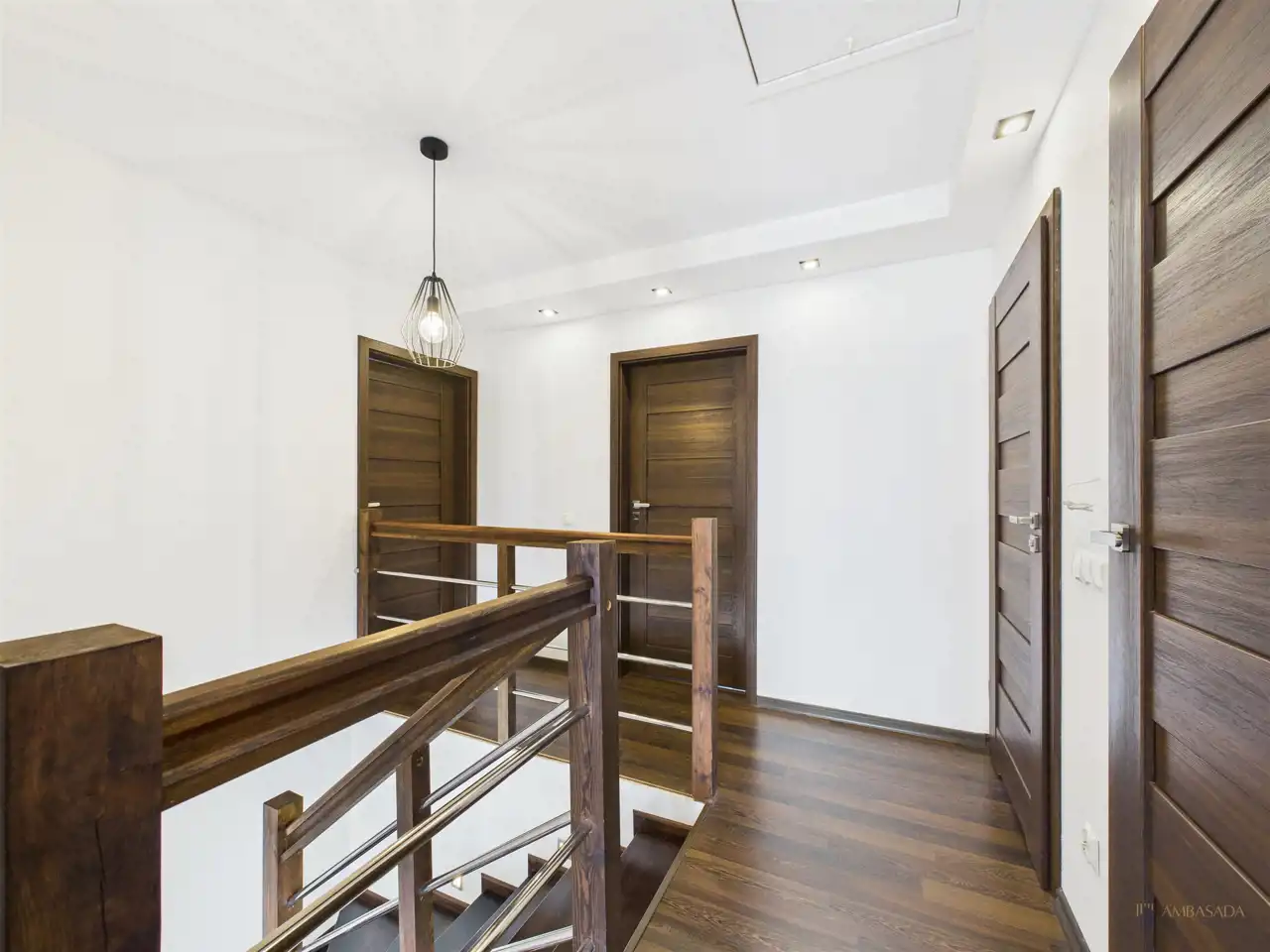 - Piętro – trzy sypialnie, duża łazienka z wanną i prysznicem, garderoba oraz dwa balkony.