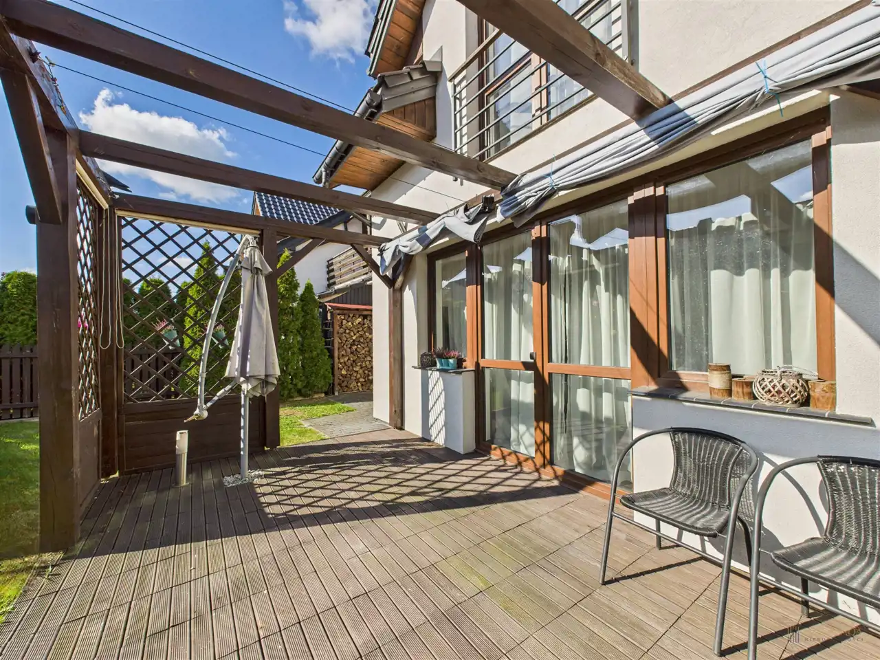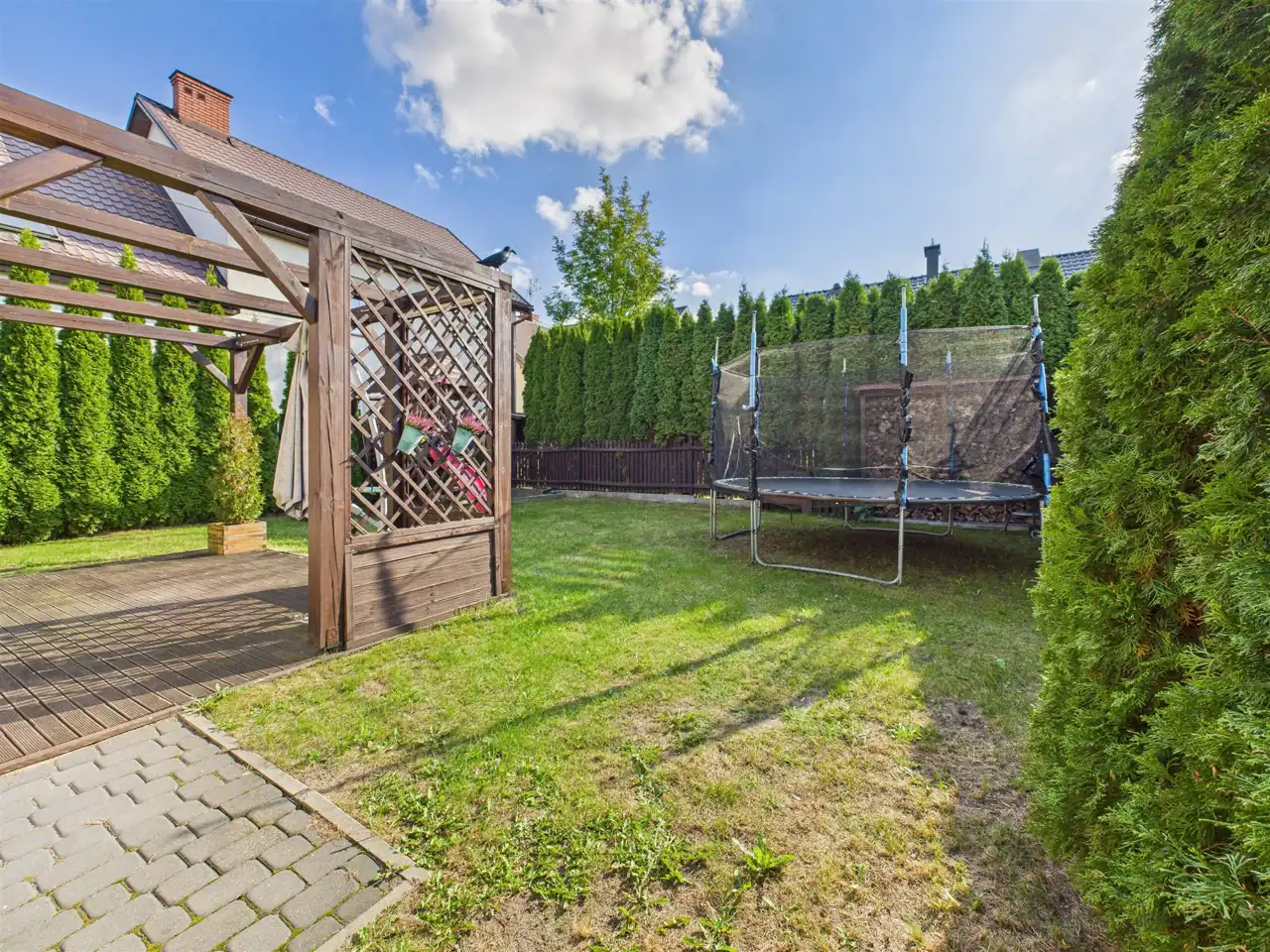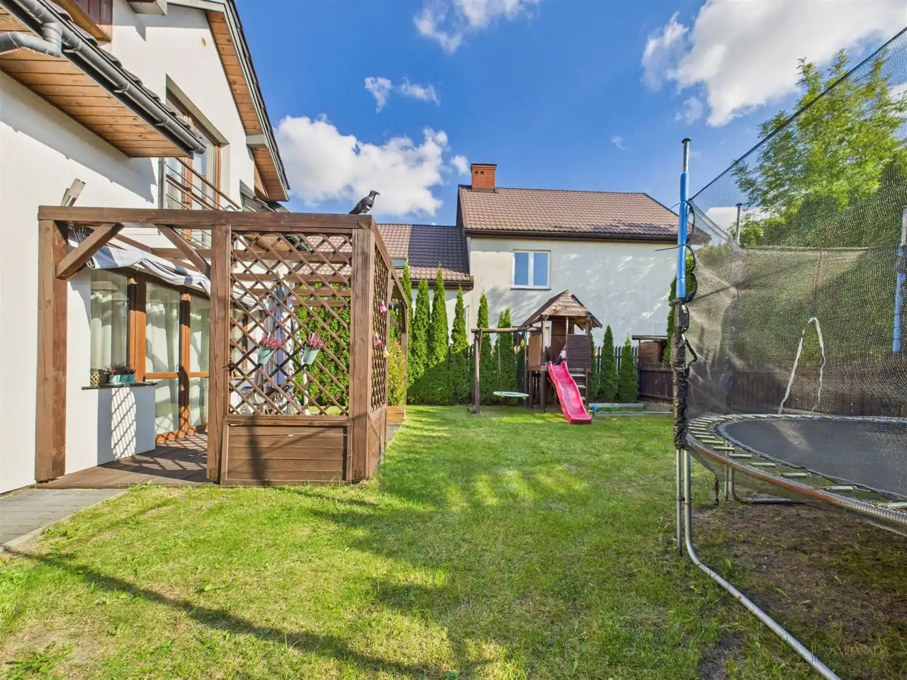 W ogrodzie znajdziesz miejsce na trampolinę, stół, leżaki – idealna przestrzeń na odpoczynek lub zabawę z dziećmi. Przy domu jest taras, na którym latem można zjeść śniadanie w słońcu. W bryle budynku znajduje się garaż oraz kotłownia, co jest bardzo praktyczne. Dom ogrzewany jest dwoma źródłami ciepła – piecem na opał stały oraz gazowym piecem dwufunkcyjnym. W budynku zastosowano centralne ogrzewanie.