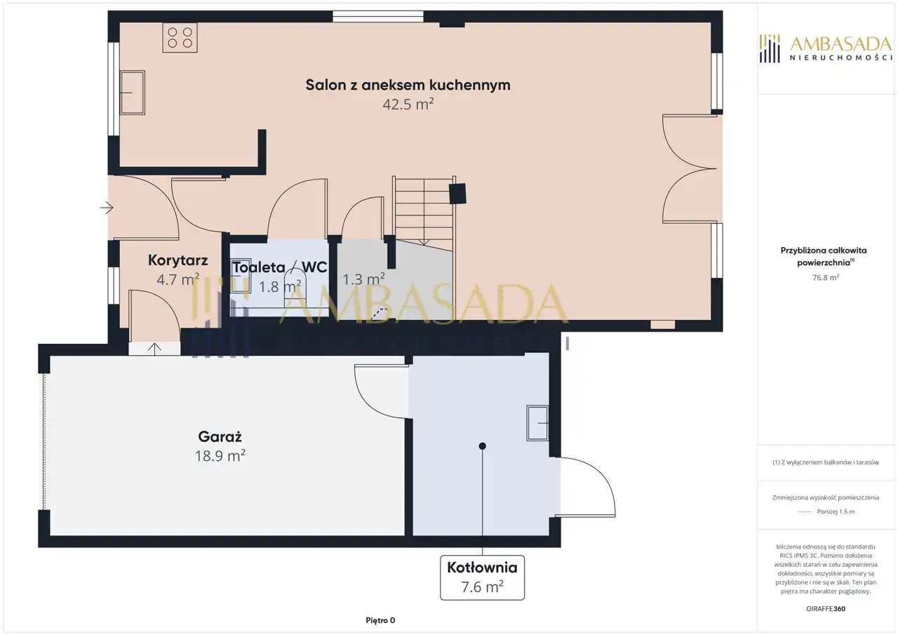 - Parter – przestronny salon z aneksem kuchennym i wyjściem na ogród, WC, pomieszczenie gospodarcze oraz hall.