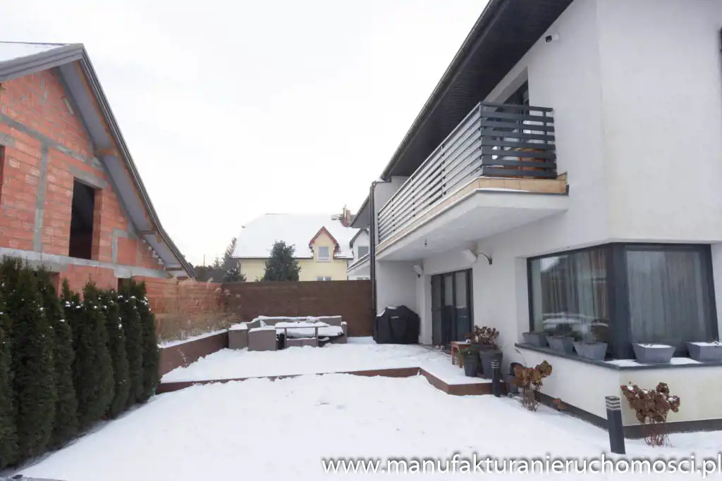 W ogrodzie trawnik został ułożony z rolki (110 m2), zamontowano automatyczne nawadnianie trawnika RAINBIRD + GARDENA sterowane z aplikacji WiFi, automatyczne oświetlenie podwórka sterowane z aplikacji WiFi. Do podlewania trawnika i napełniania basenu wodą, wykopano studnię głębinową z możliwością dodatkowego zasilania domu w wodę.