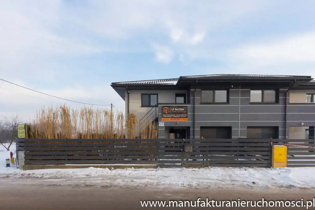 Budynek: w zabudowie bliźniaczej o stonowanej kolorystyce, tynk i okładzina z konglomeratów;