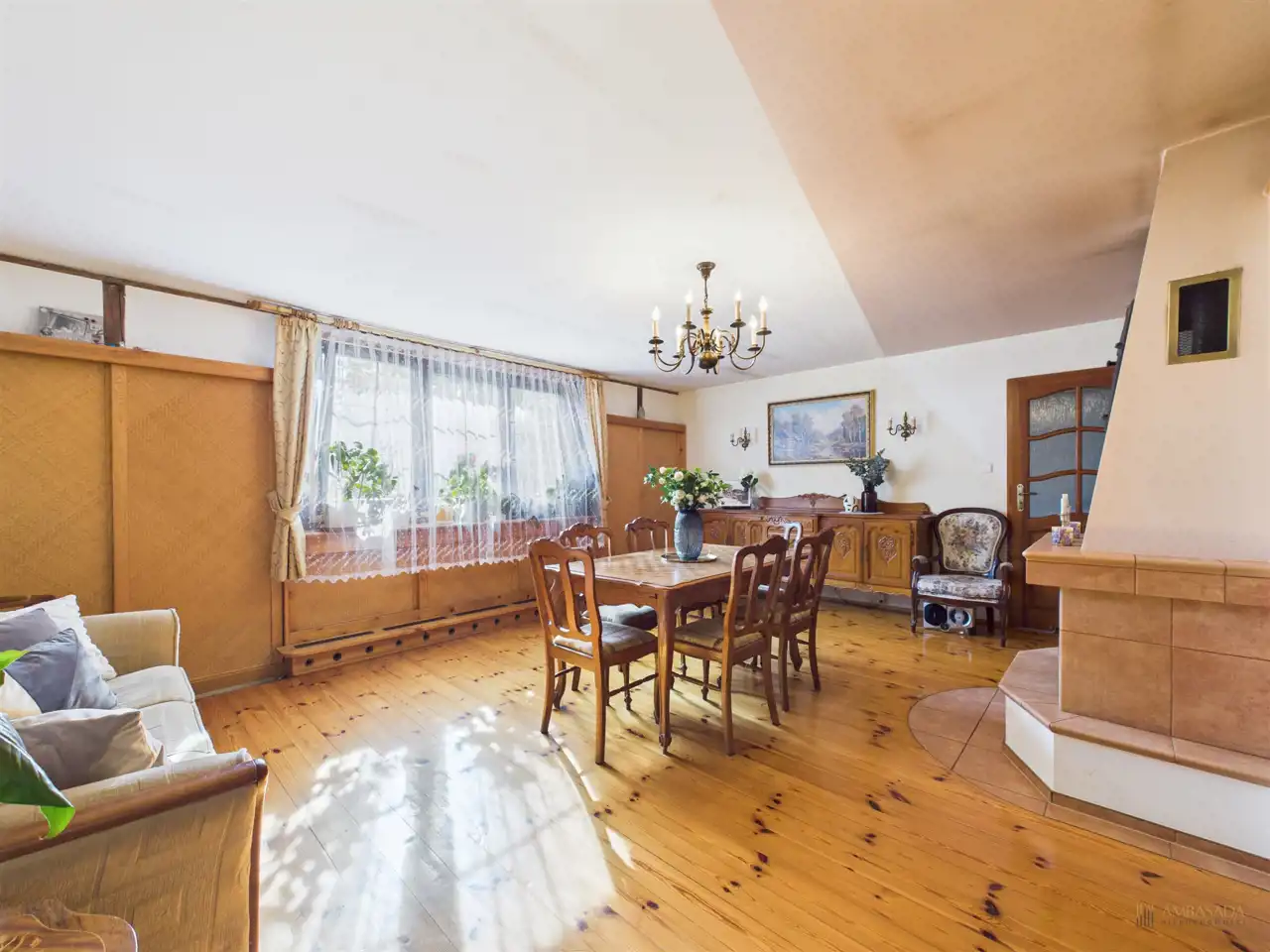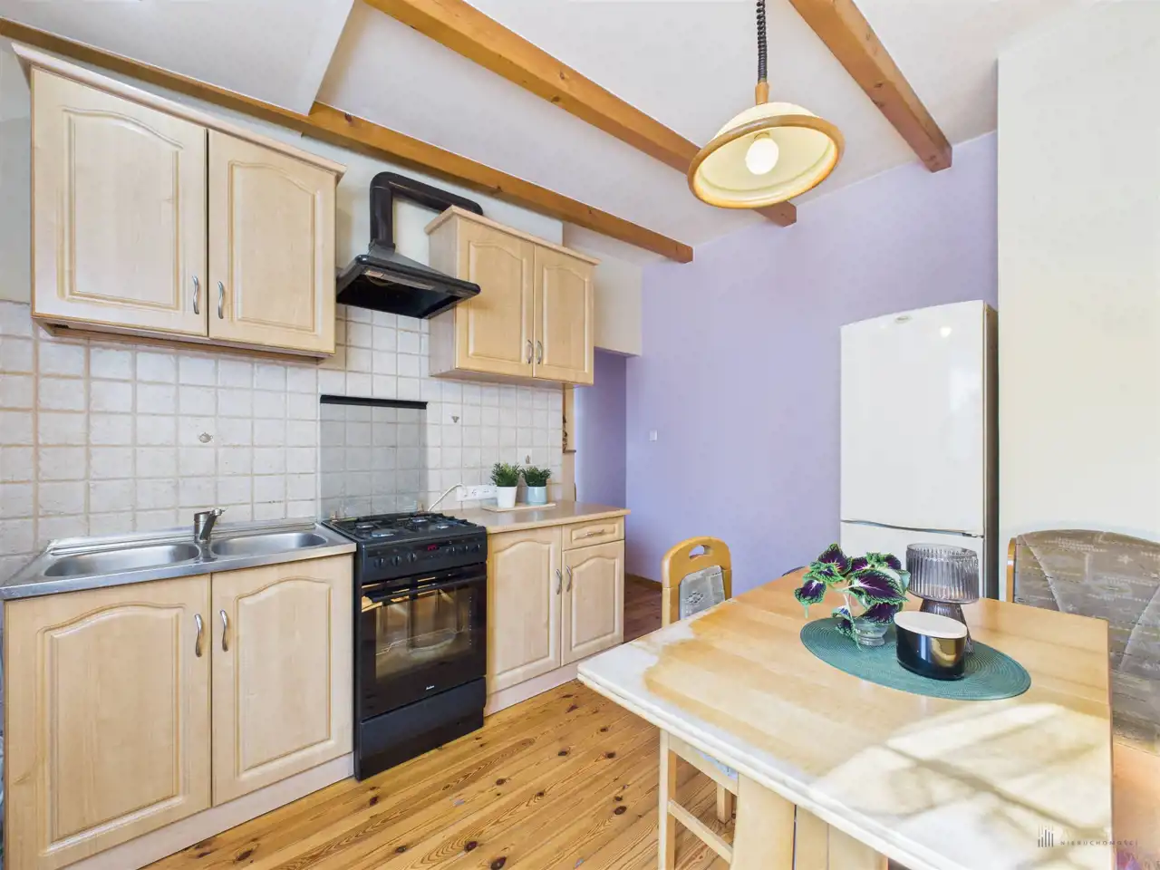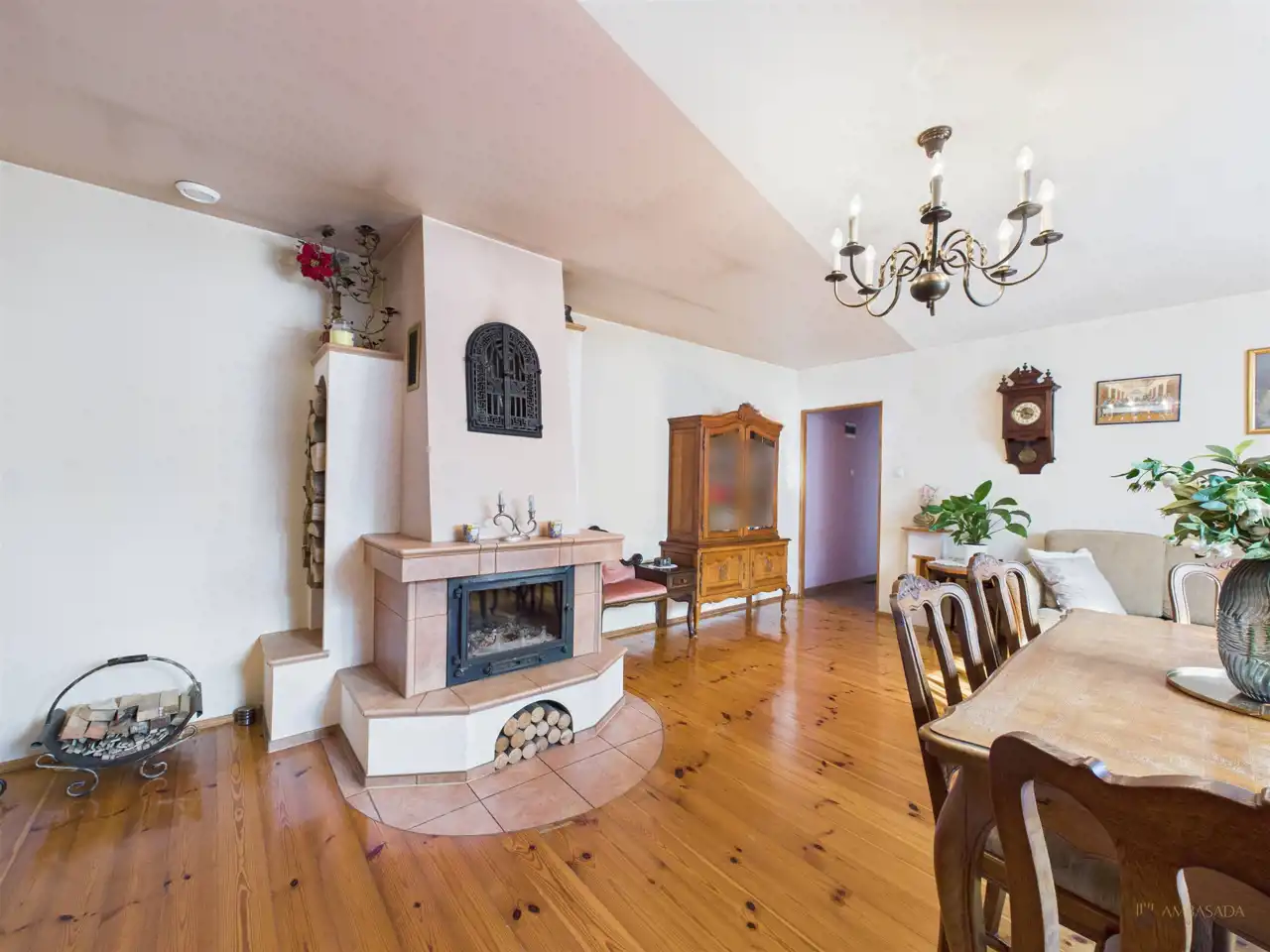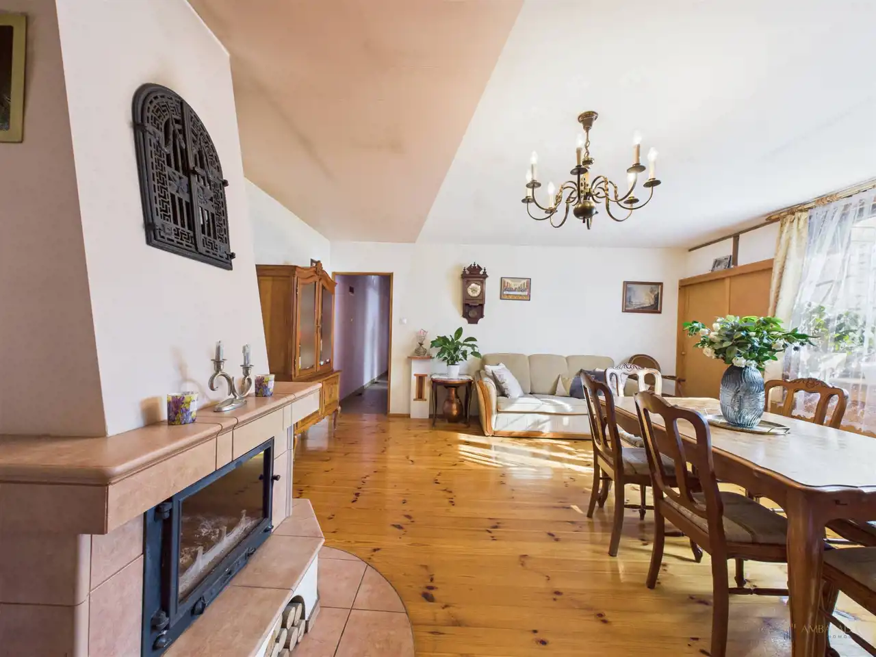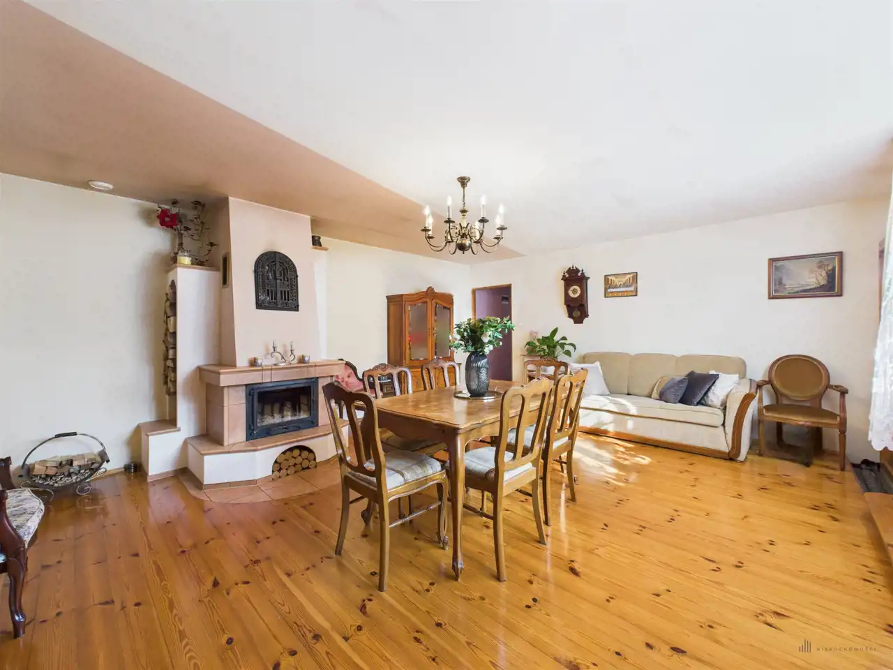 Na piętrze znajduje się mieszkanie o pow. około 86 m2, na którą składają się 3 pokoje, kuchnia i łazienka. Mieszkanie w dobrym standardzie- na podłogach płytki i panele. Nowe okna drewniane. Do mieszkania jest wejście przez klatkę schodową. Powierzchnia mieszkalna ogrzewana jest kominkiem.