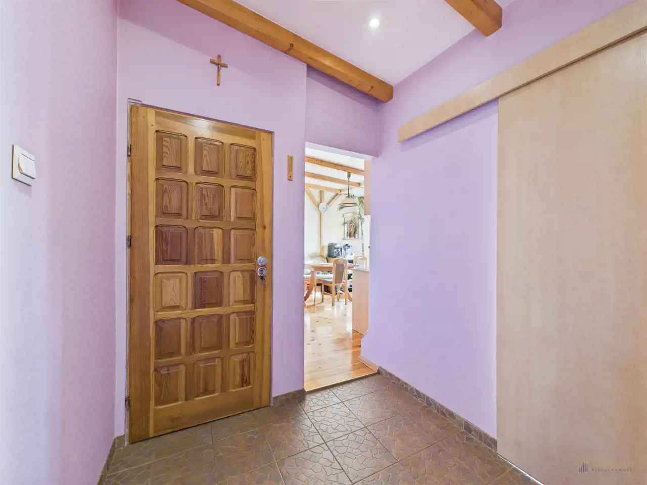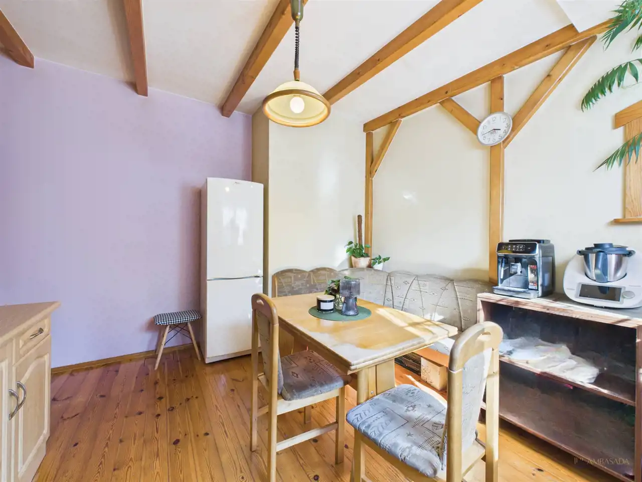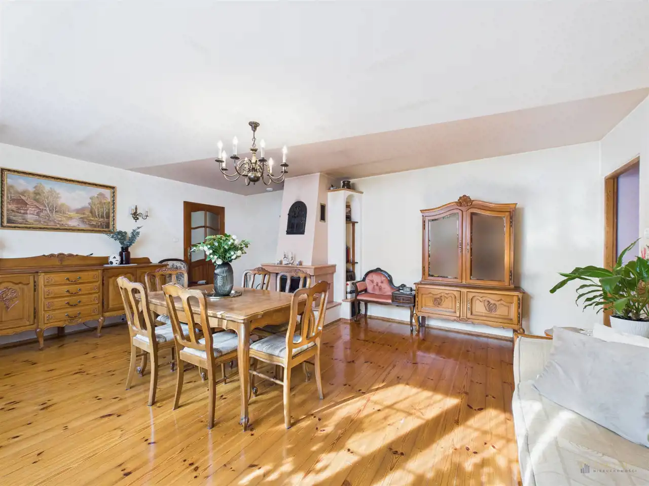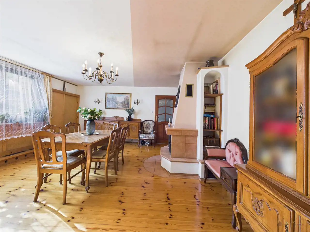 Na piętrze znajduje się mieszkanie o pow. około 86 m2, na którą składają się 3 pokoje, kuchnia i łazienka. Mieszkanie w dobrym standardzie- na podłogach płytki i panele. Nowe okna drewniane. Do mieszkania jest wejście przez klatkę schodową. Powierzchnia mieszkalna ogrzewana jest kominkiem.