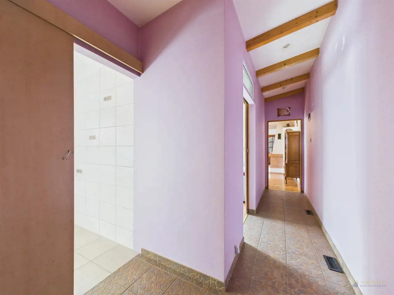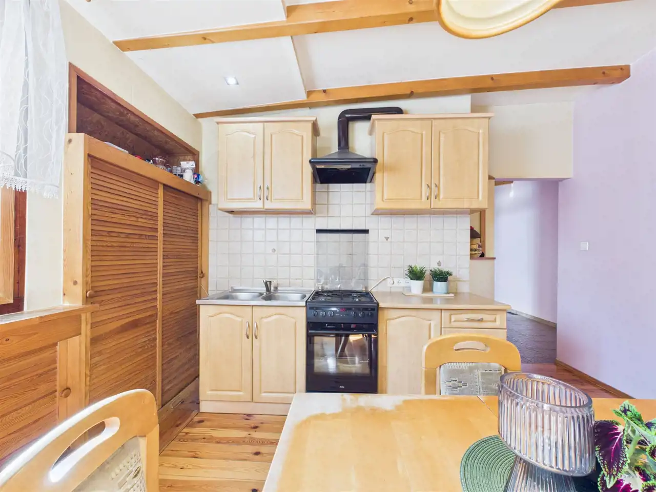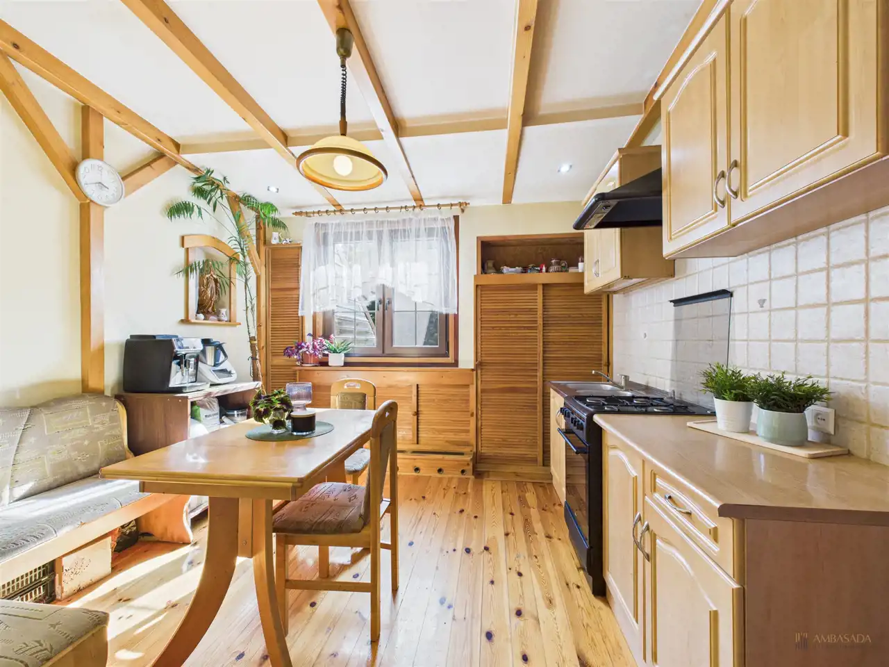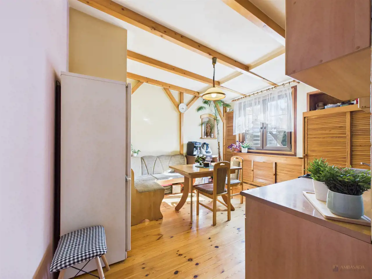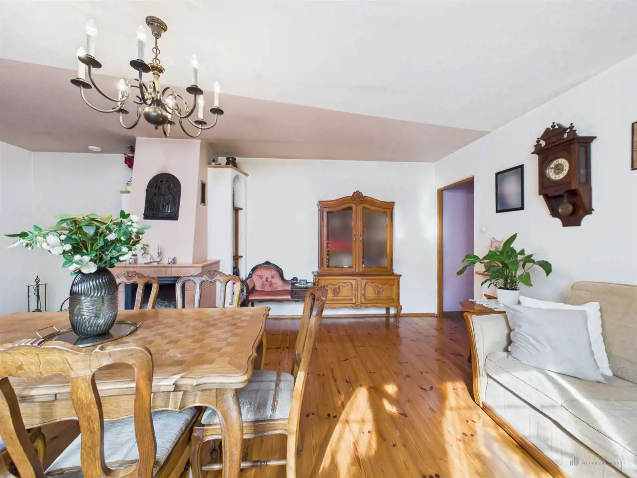 Na piętrze znajduje się mieszkanie o pow. około 86 m2, na którą składają się 3 pokoje, kuchnia i łazienka. Mieszkanie w dobrym standardzie- na podłogach płytki i panele. Nowe okna drewniane. Do mieszkania jest wejście przez klatkę schodową. Powierzchnia mieszkalna ogrzewana jest kominkiem.
