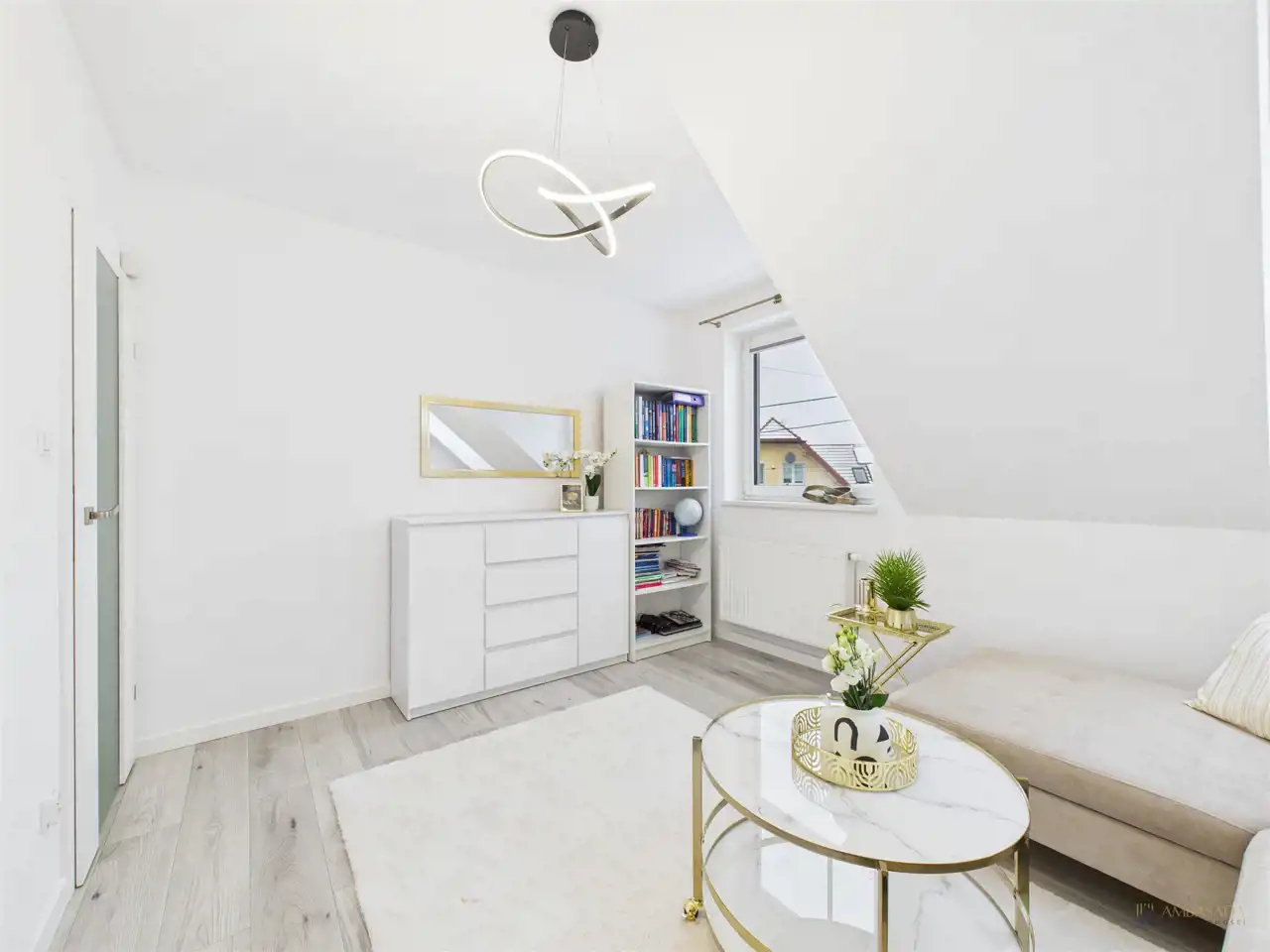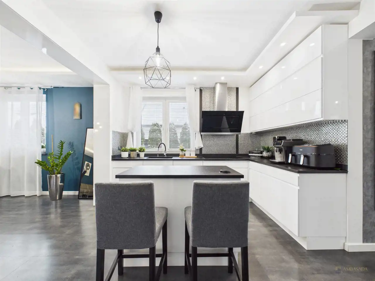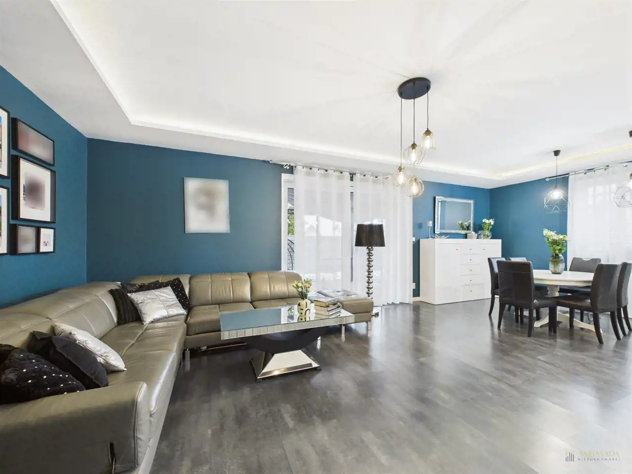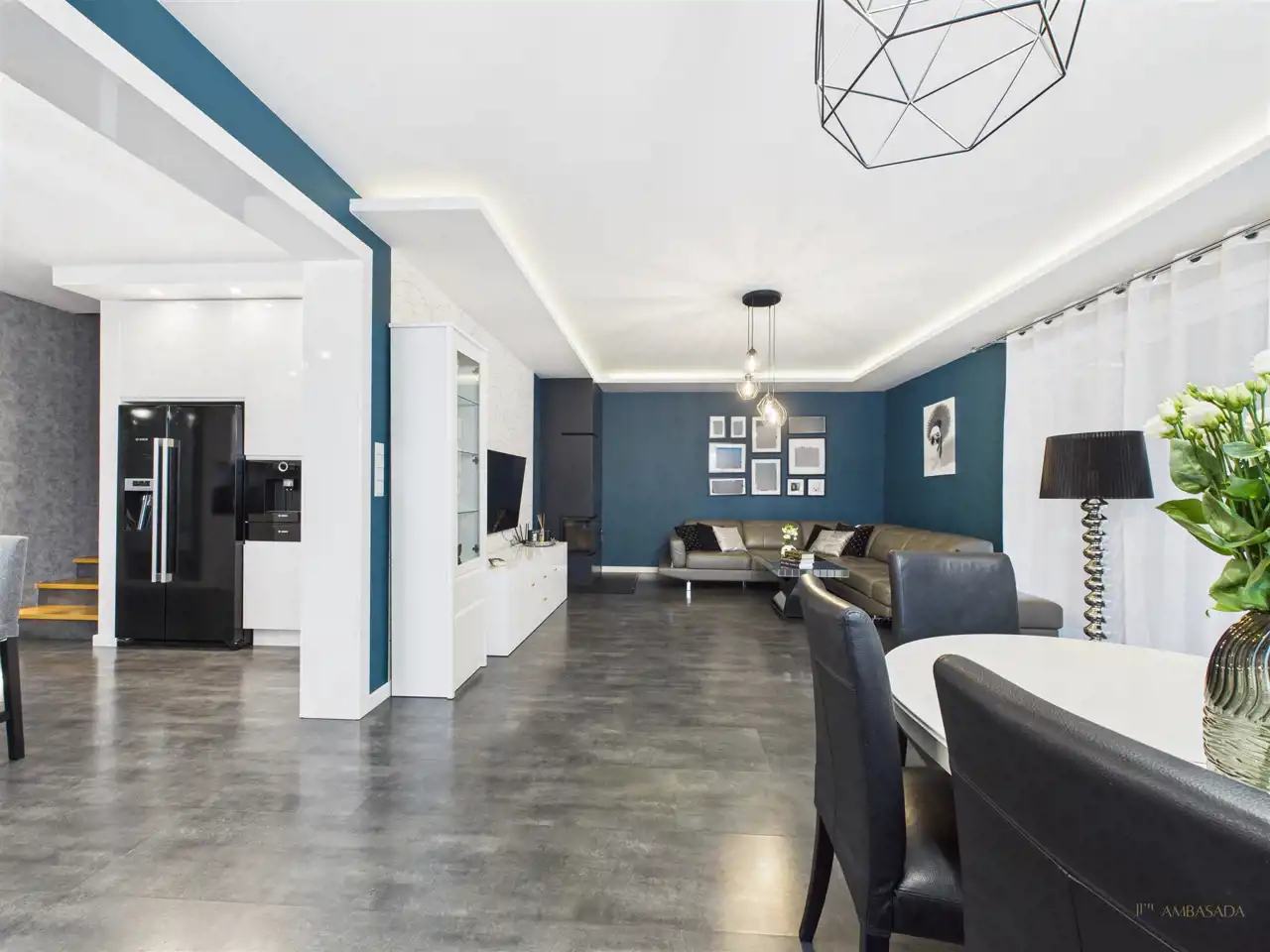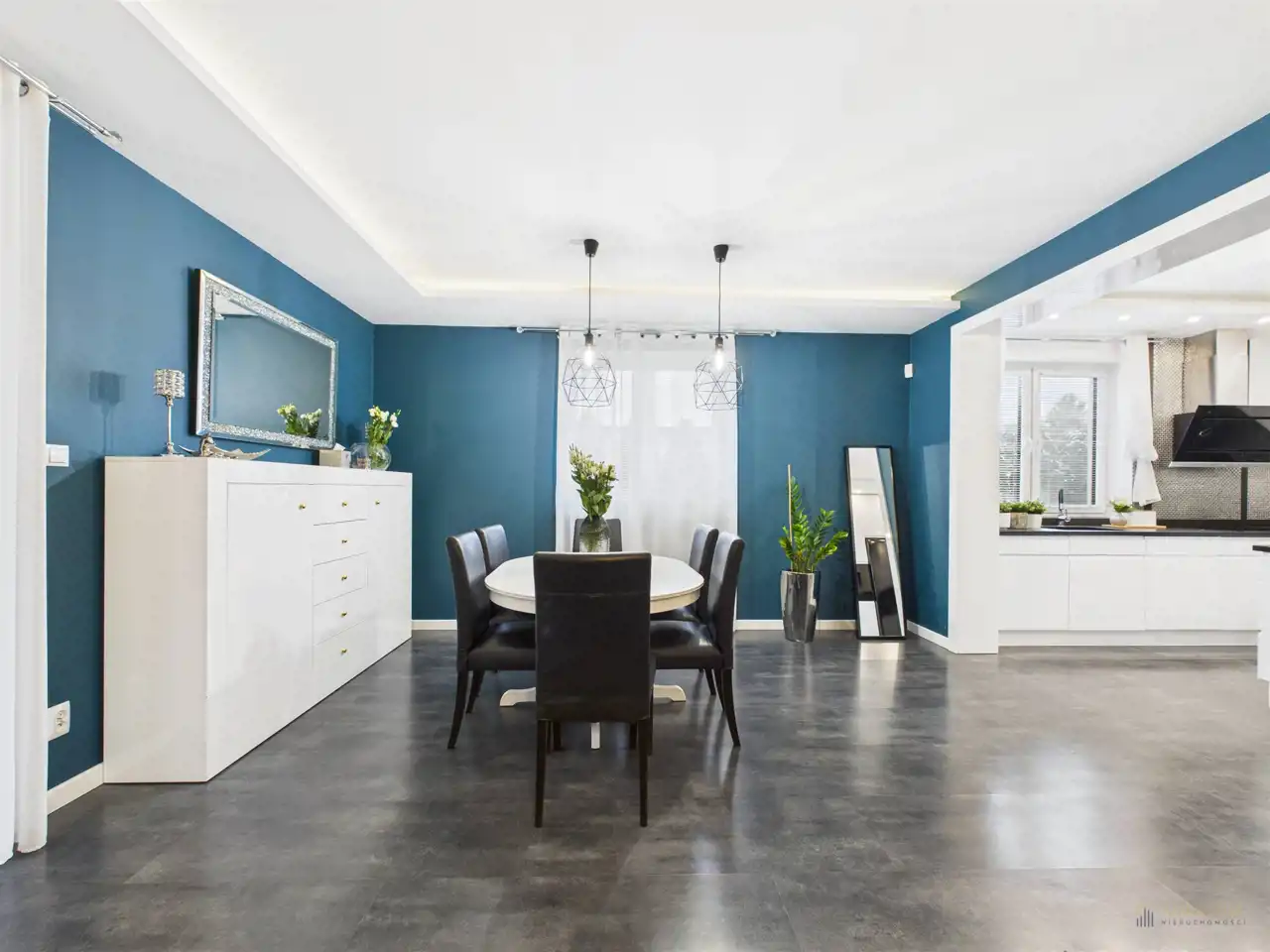 - przestronna strefa dzienna połączona z kuchnią i salonem,