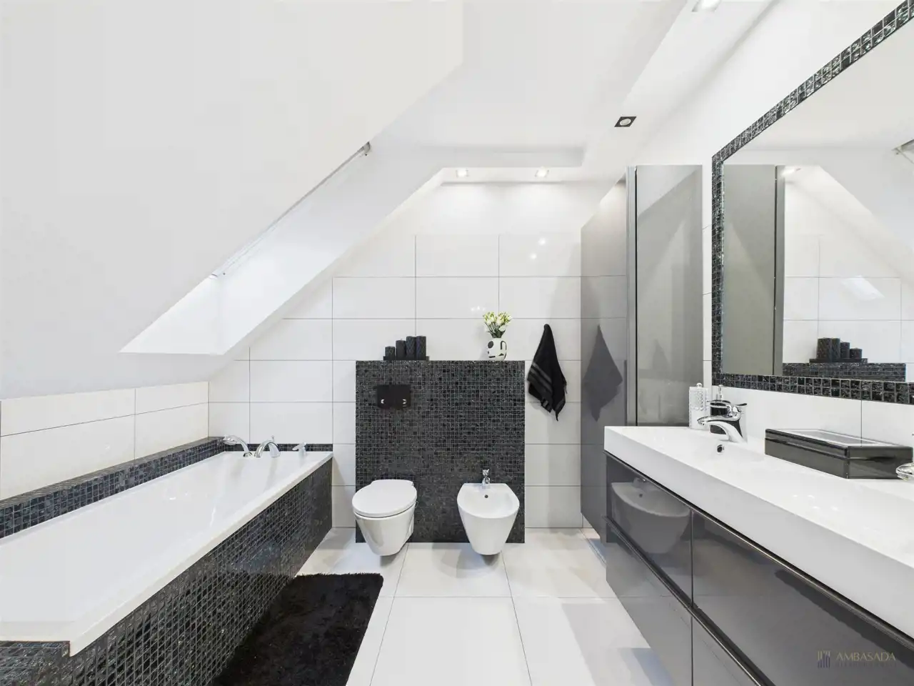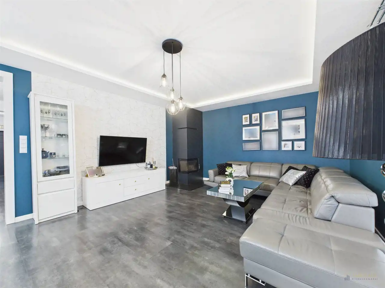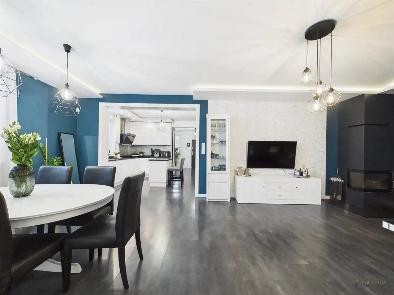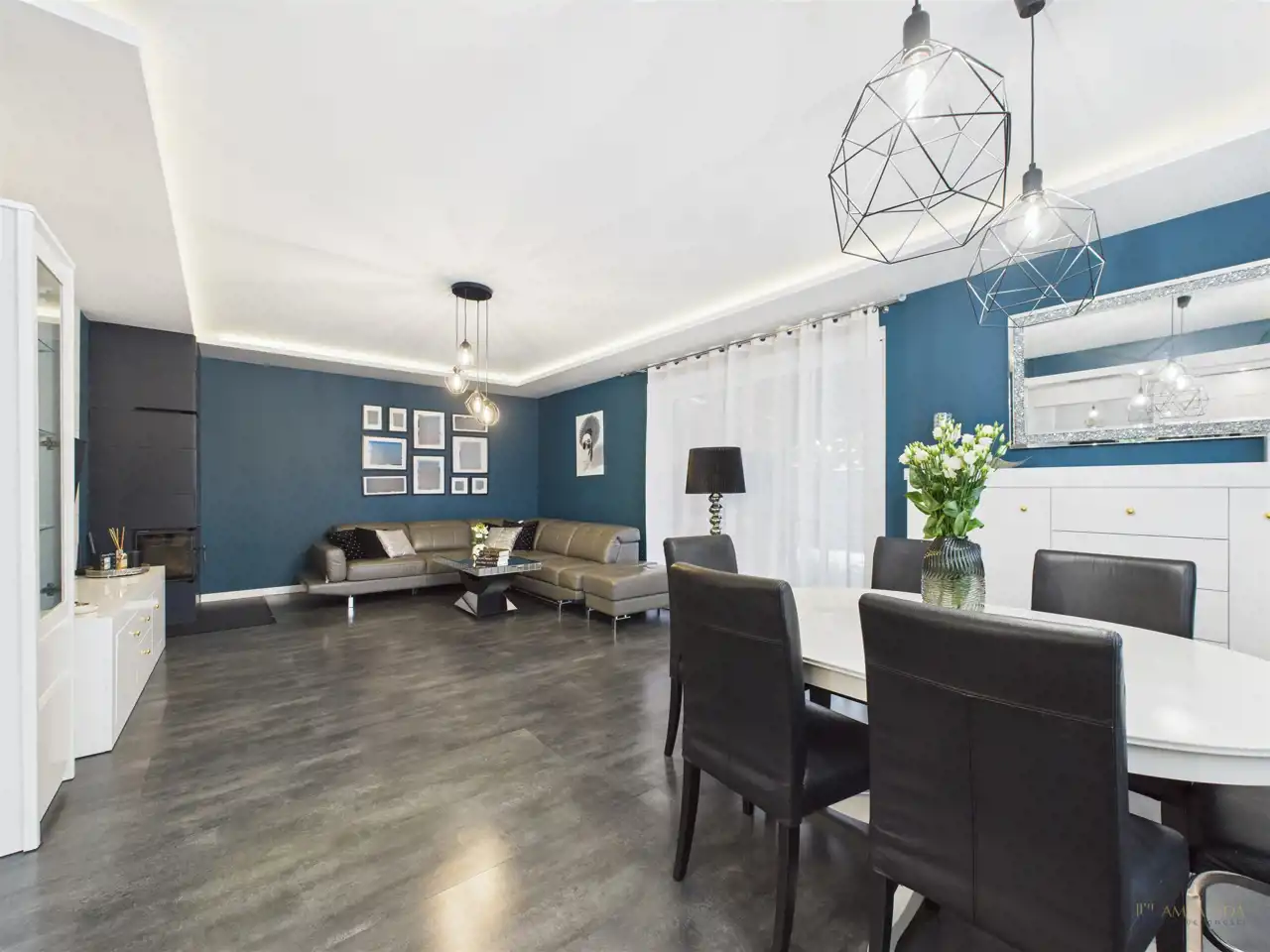 Dodatkowa przestrzeń to bardzo przestronny salon z kominkiem i jadalnią, połączony z wyjściem na taras. Zaprojektowane w spójnej, ciemnej kolorystyce z elementem nowoczesności.