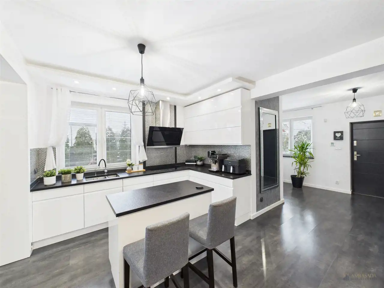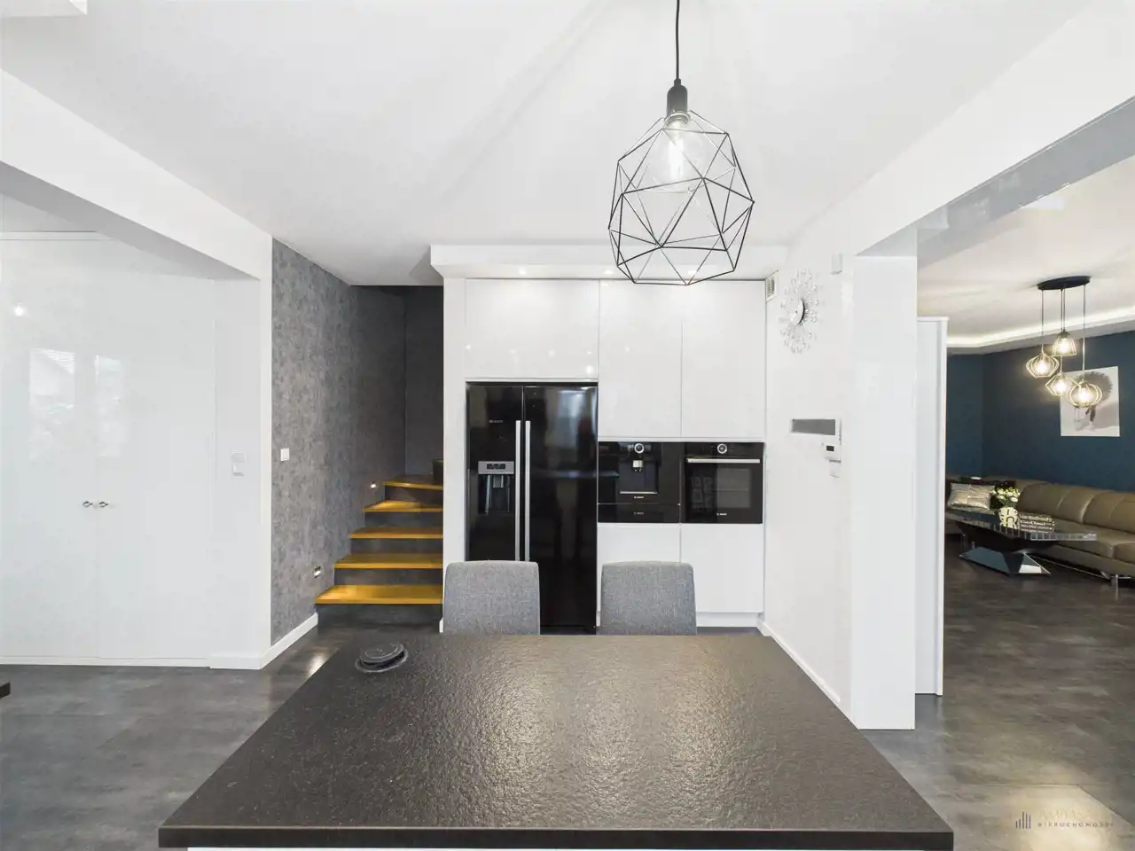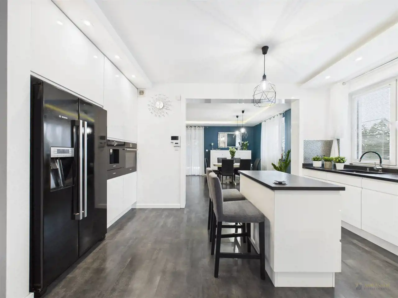 Centralnym punktem domu jest otwarty pokój dzienny, który wraz z kuchnią i jadalnią tworzy gustowne wnętrze. Na uwagę zasługuje duża, ergonomicznie urządzona kuchnia, z kamiennymi blatami, wyposażona w zabudowany sprzęt tj. piekarnik, mikrofalówka, zmywarka, lodówka Side by Side, płyta indukcyjna. Zaprojektowanie wyspy z wbudowanymi szafkami w centralnej części kuchni to wygodne rozwiązanie. Zdecydowanie miejsce dla tych, którzy lubią gotować. Na dole panele i ogrzewanie podłogowe. Nieruchomość zaprojektowana w przemyślany i funkcjonalny sposób. Dom wyposażony w instalację alarmową i wideofon.